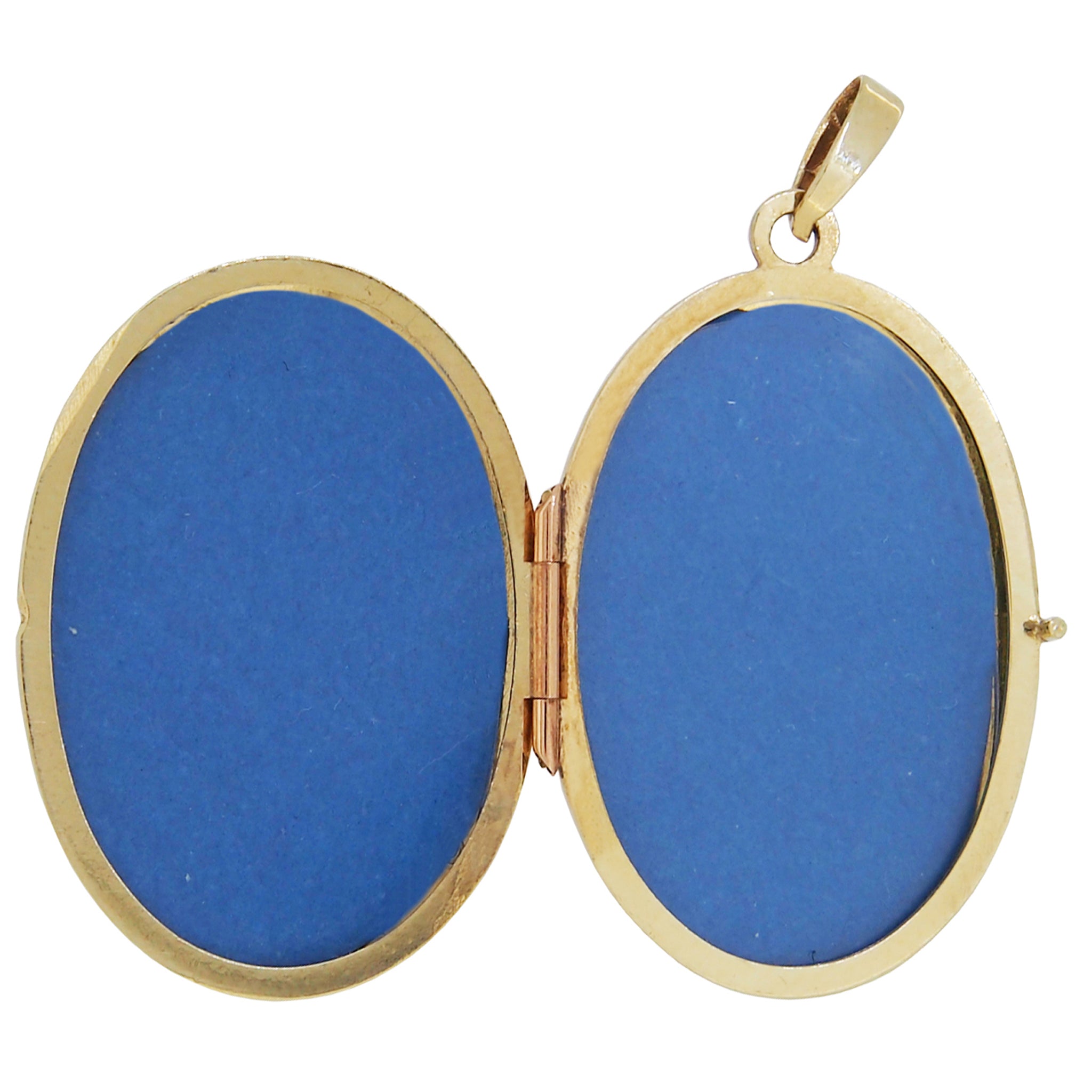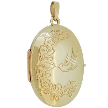 A modern, 9ct yellow gold, oval locket, engraved with a bird & flowers.