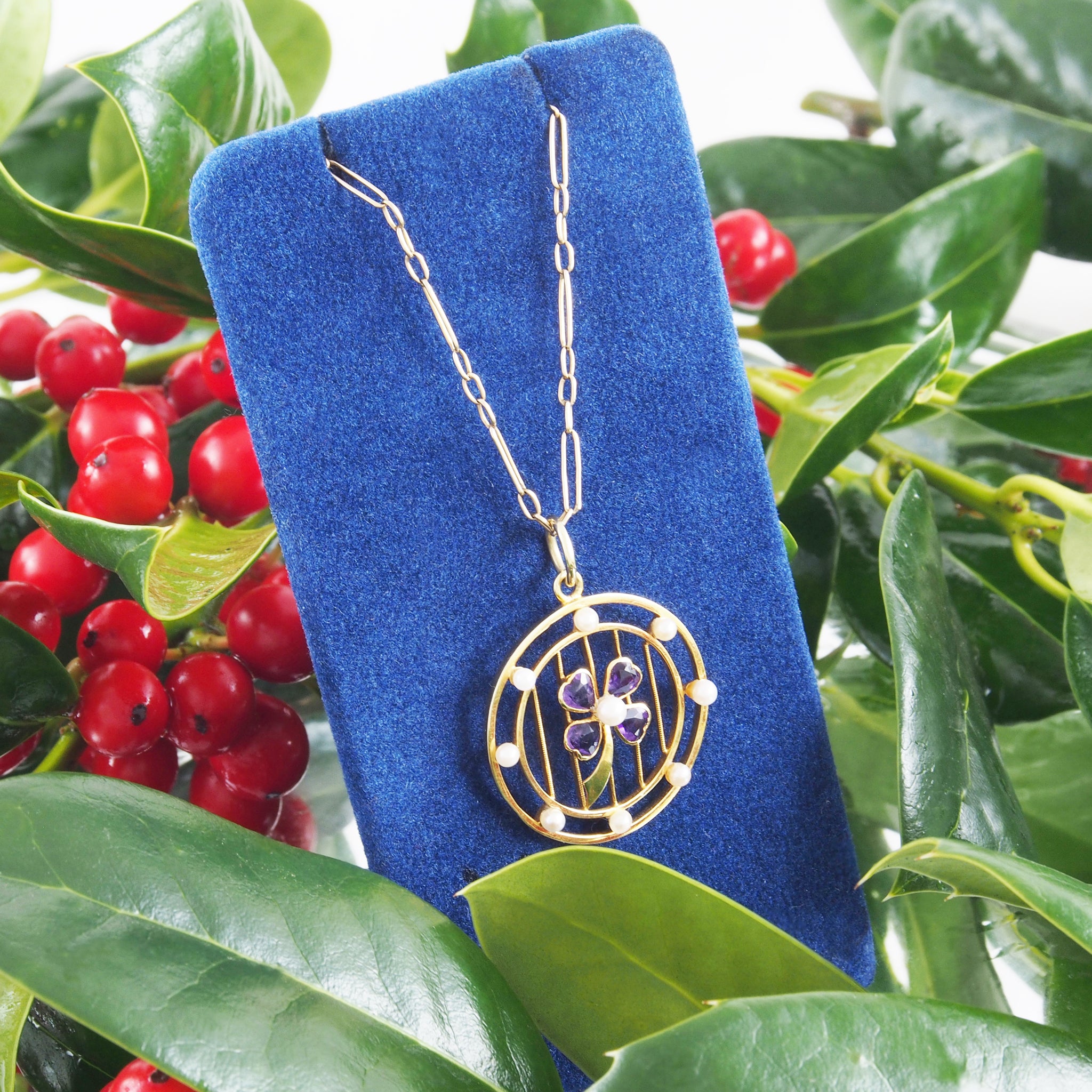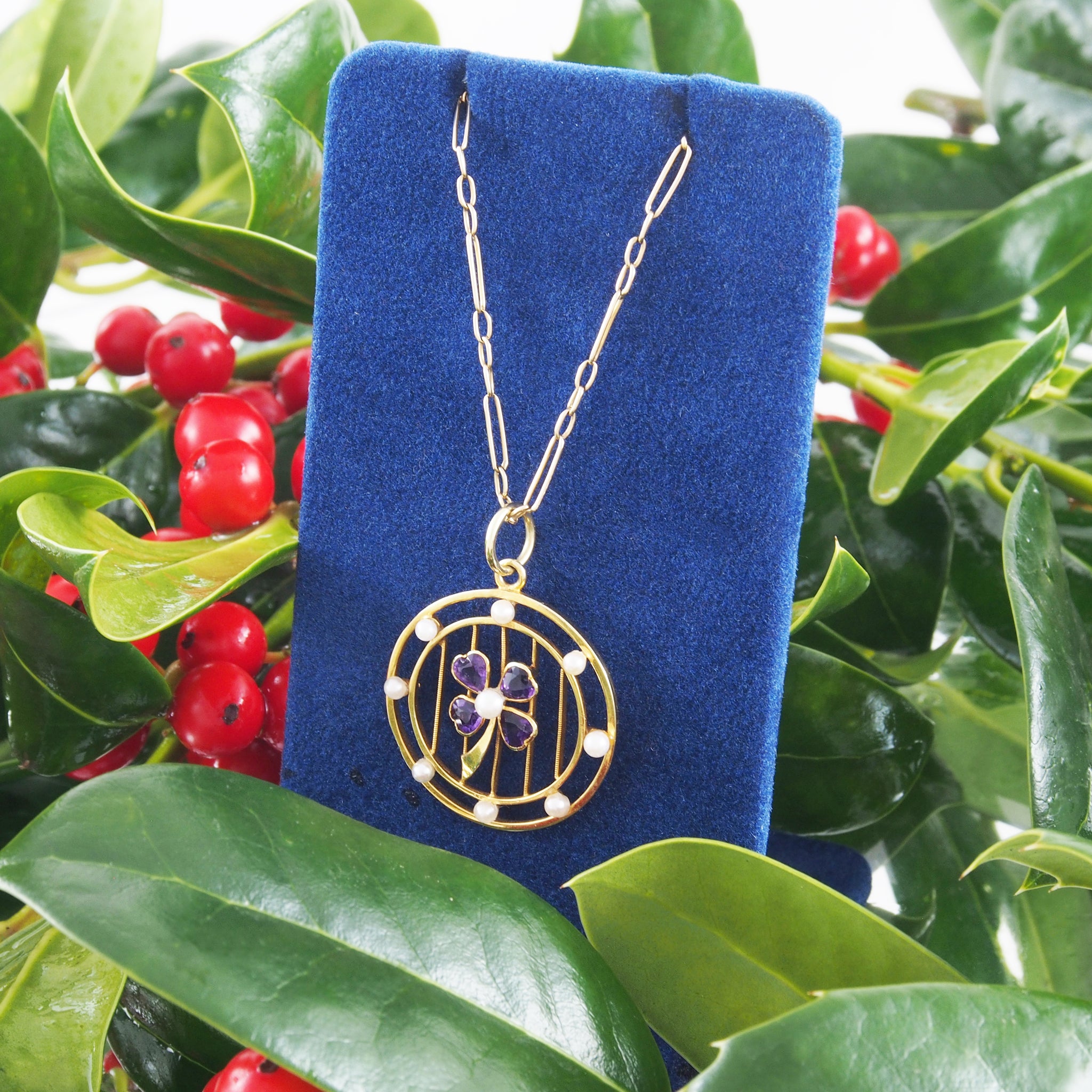 An Edwardian, 9ct yellow gold, amethyst & pearl set circular pendant & chain.