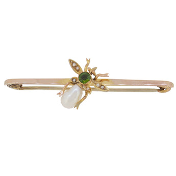 A Victorian, 9ct yellow gold, peridot & pearl set insect bar brooch.