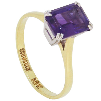 A modern, 18ct yellow gold, amethyst set, single stone ring.