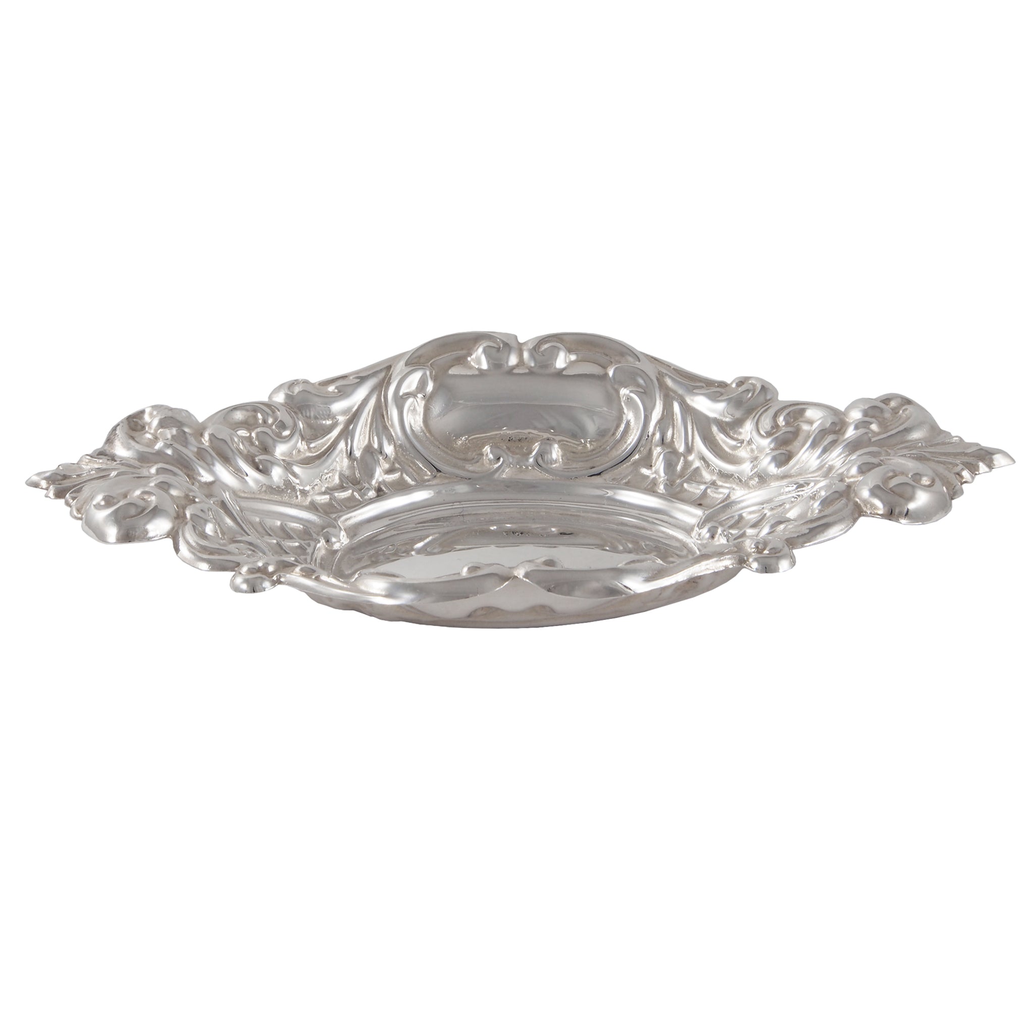 A modern, silver, oval bon bon dish.