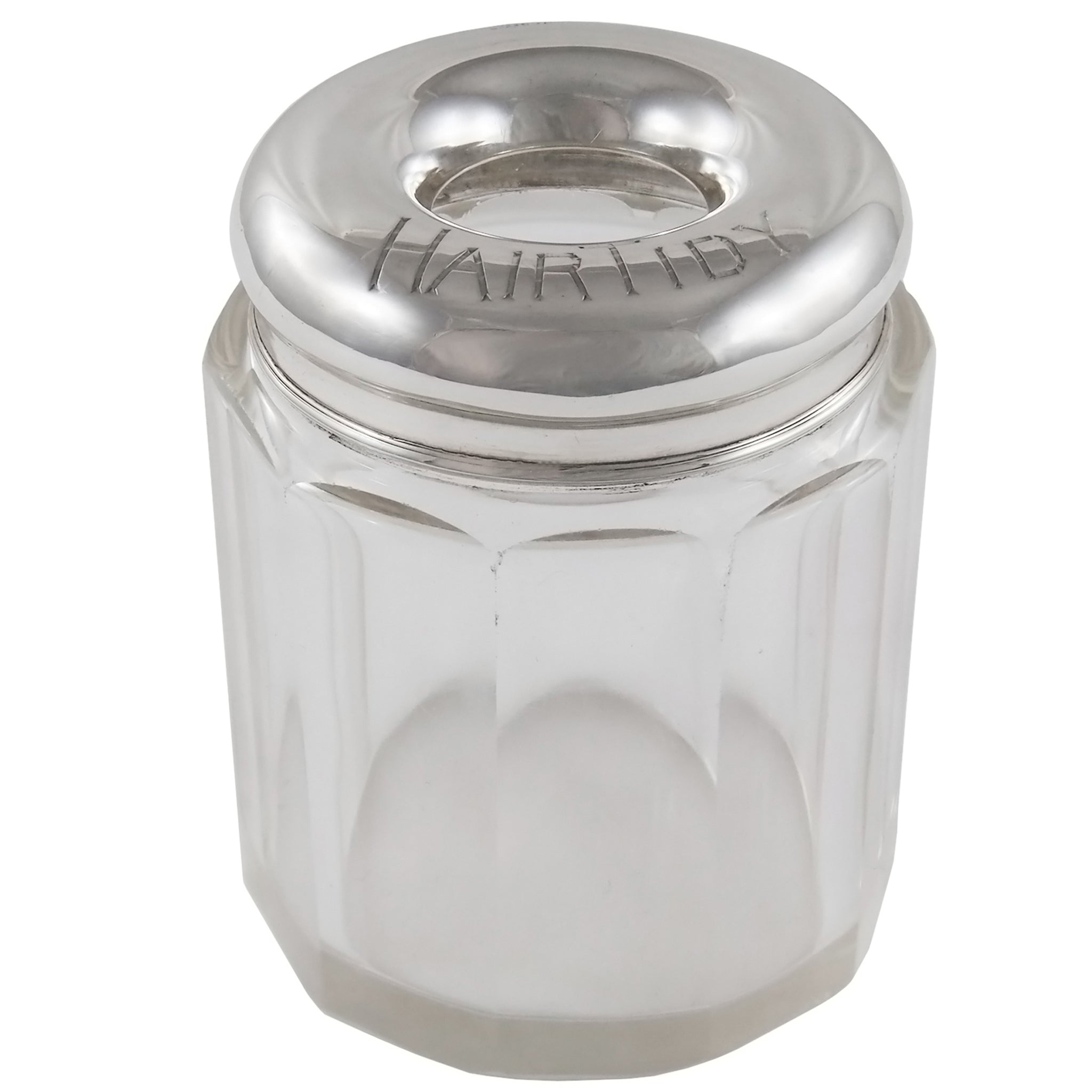 An Edwardian, glass hair tidy with a silver lid, engraved with HAIR TIDY.
