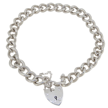 A modern, silver, heavy, curb link bracelet with a padlock clasp.
