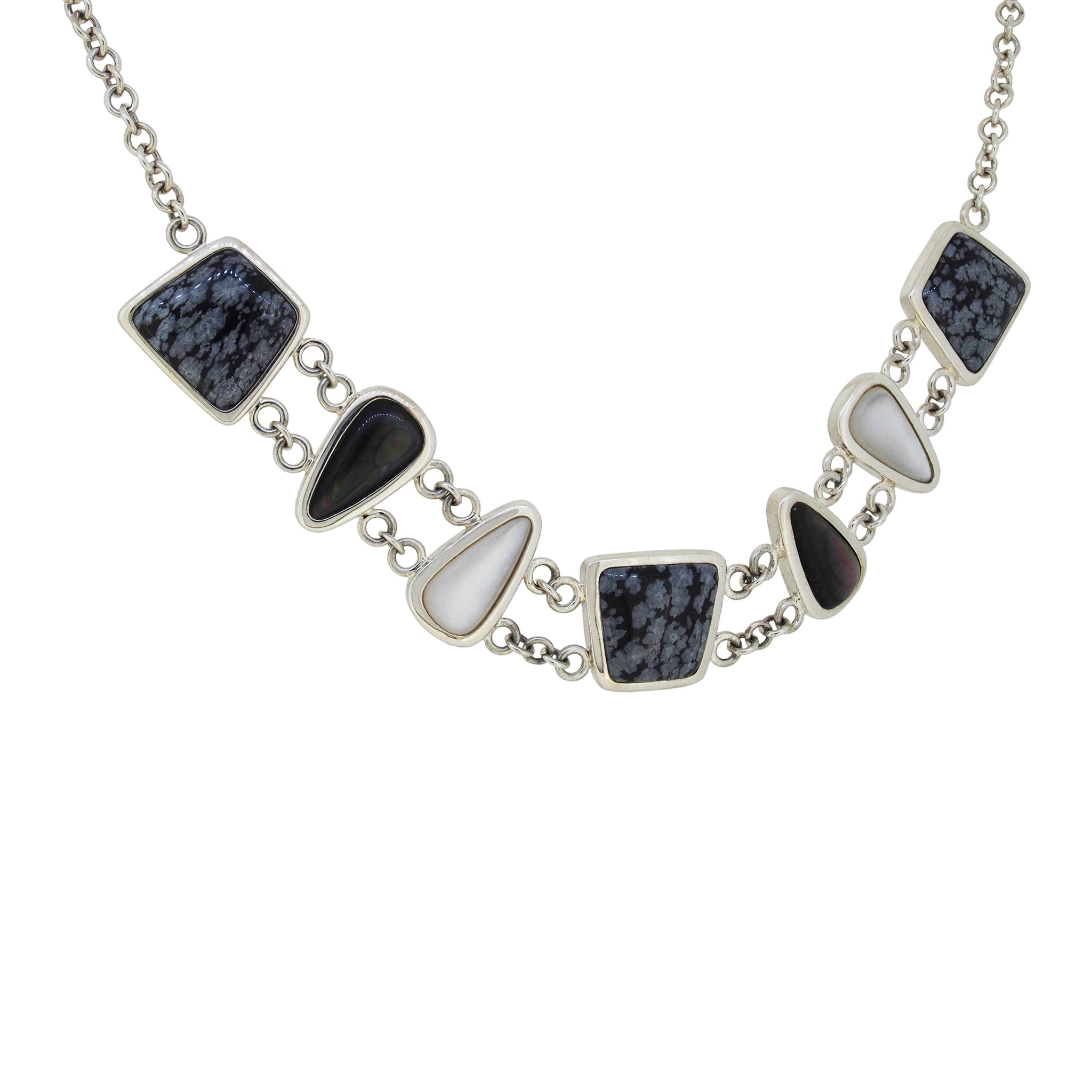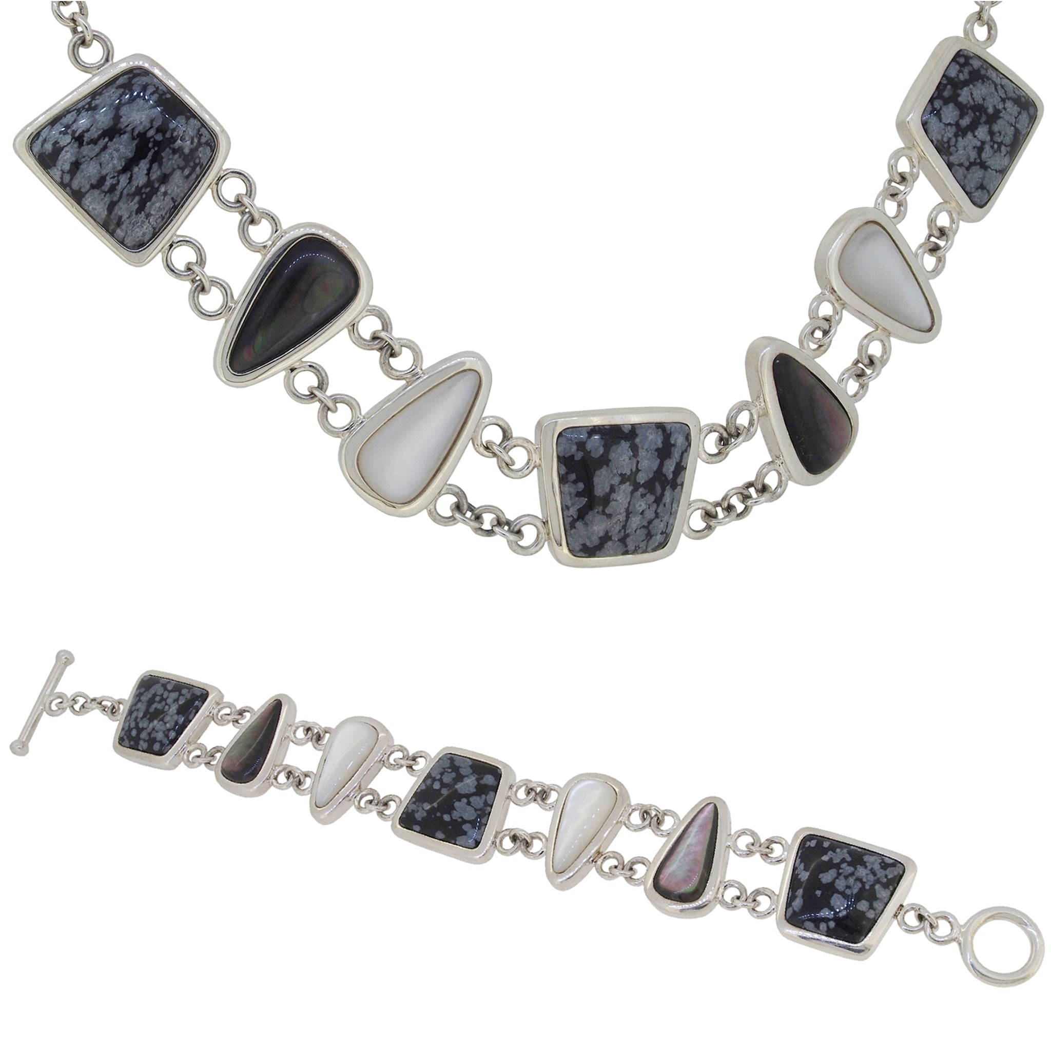 A modern, silver, mother of pearl & black & grey agate set bracelet & necklace.