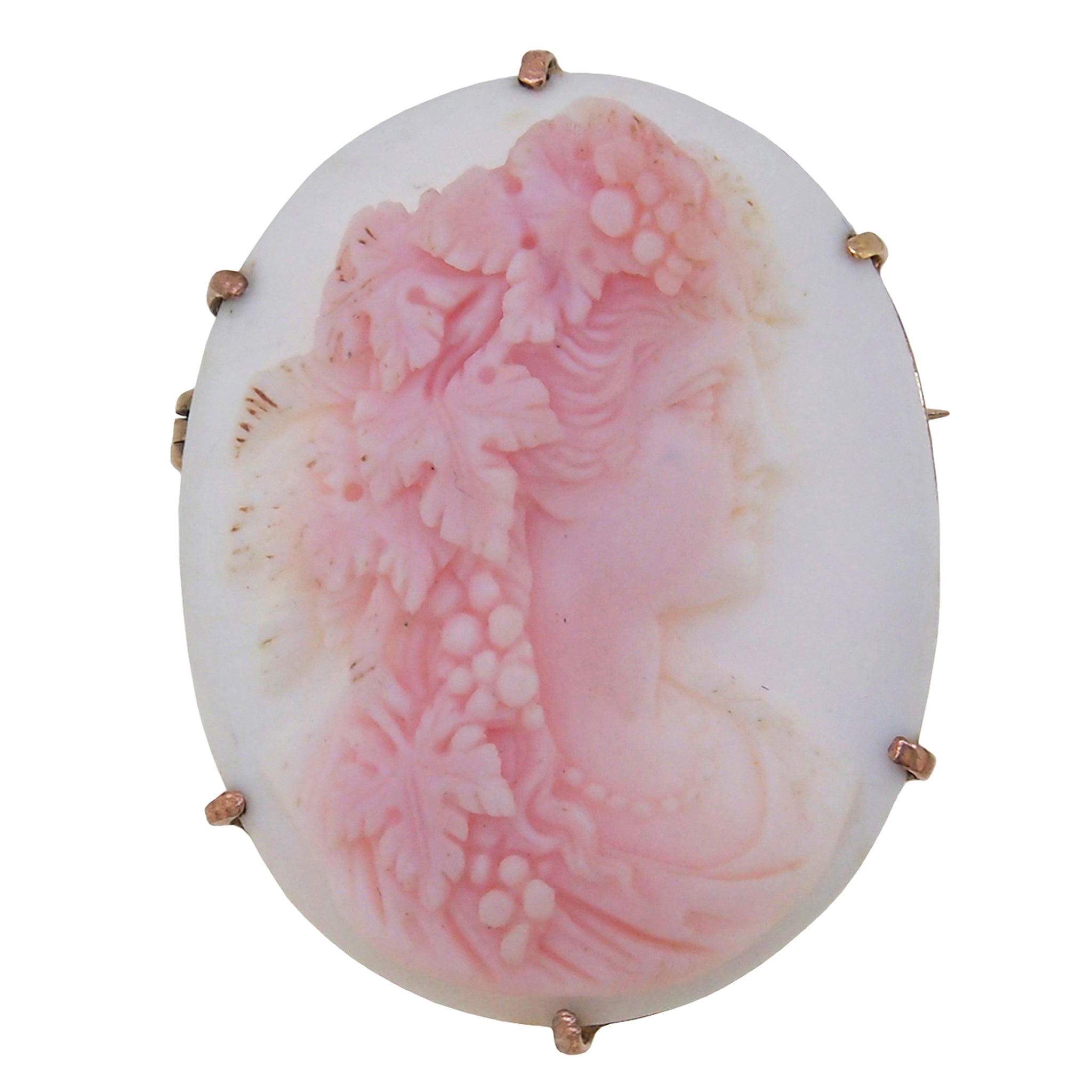 An early 20th century, yellow gold, pink cameo brooch featuring an image of Bacchus.