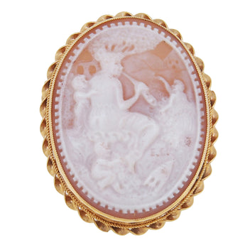 A modern, 9ct yellow gold cameo brooch with a cord border, featuring an image of a lady & cherubs.