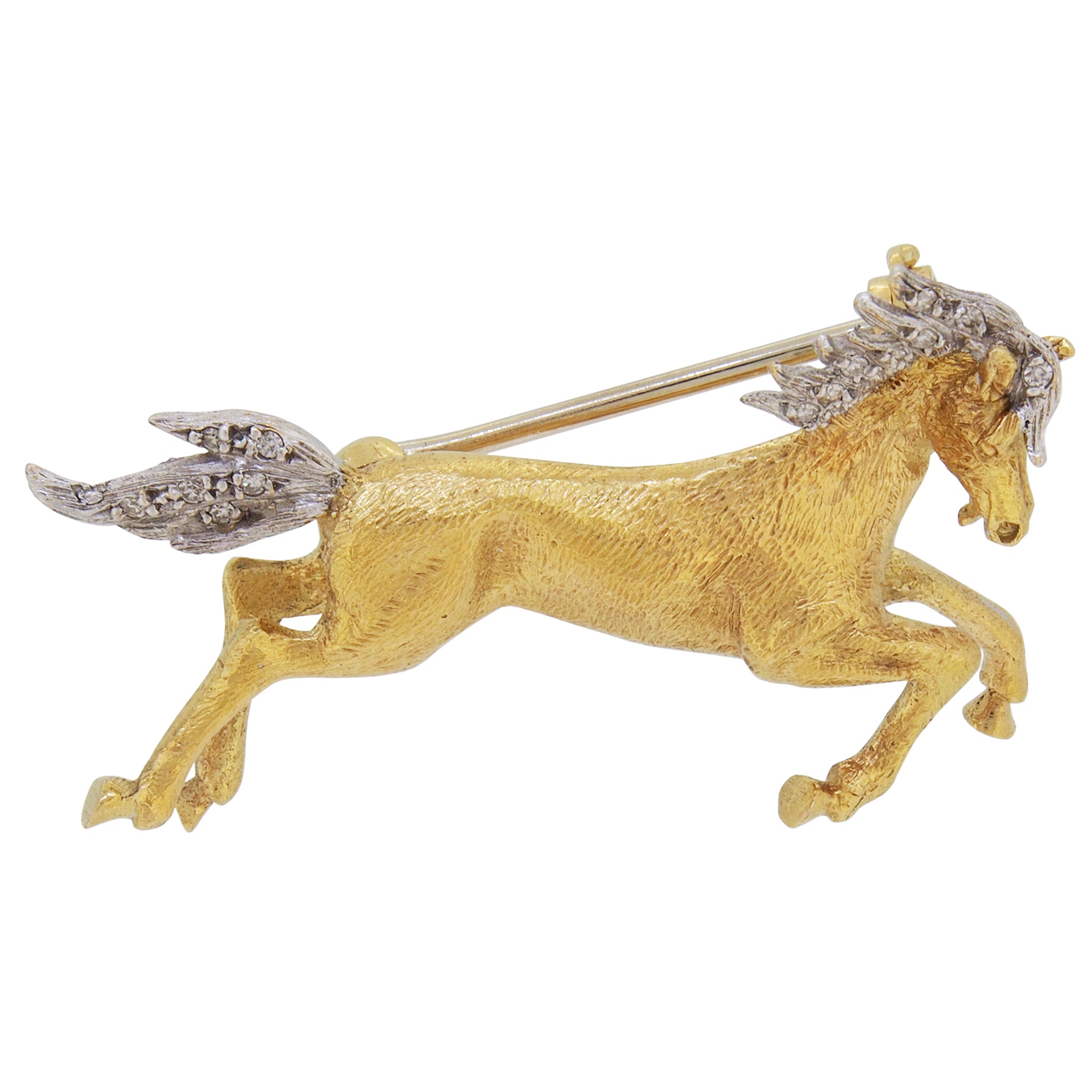 A modern, 18ct yellow gold, diamond set horse set brooch.