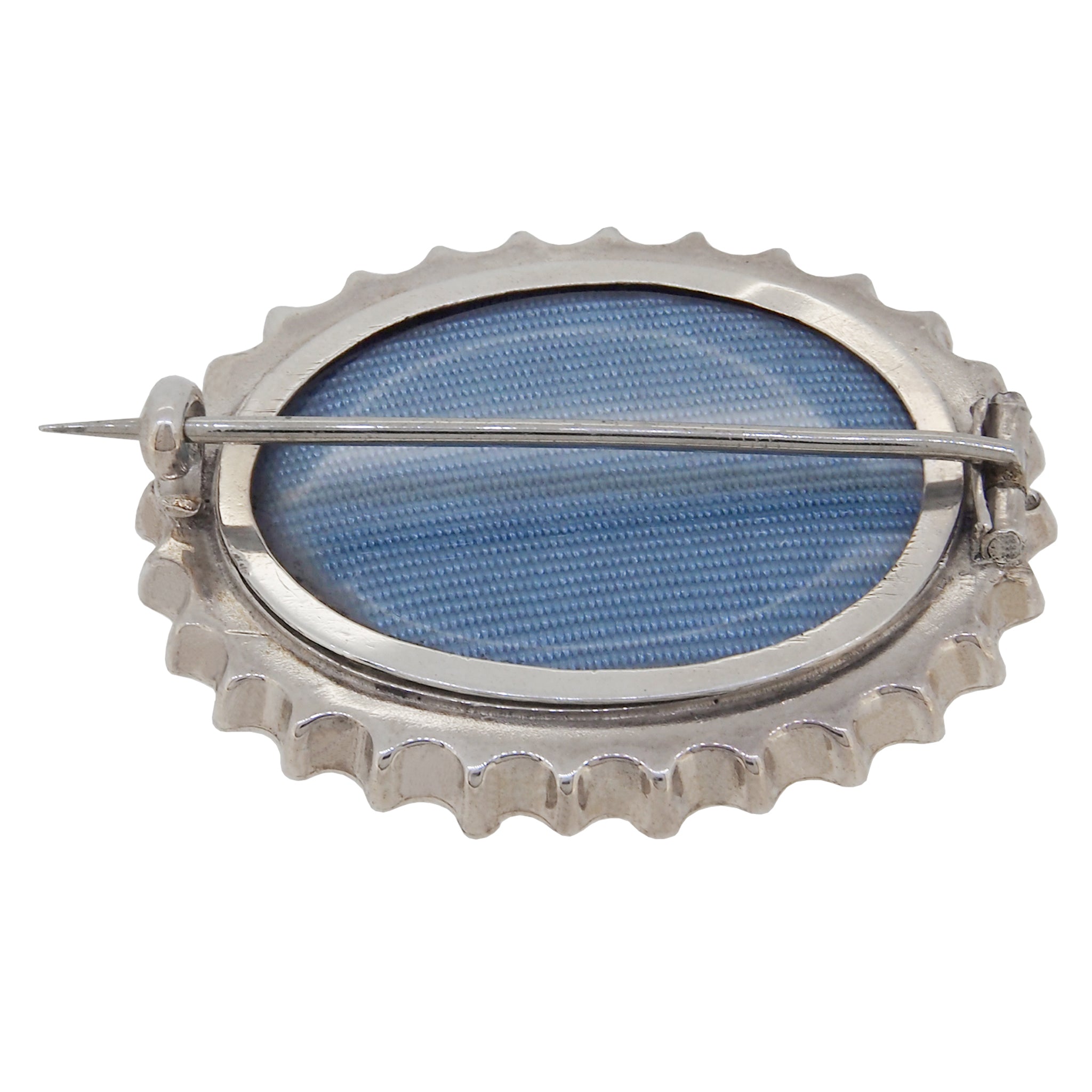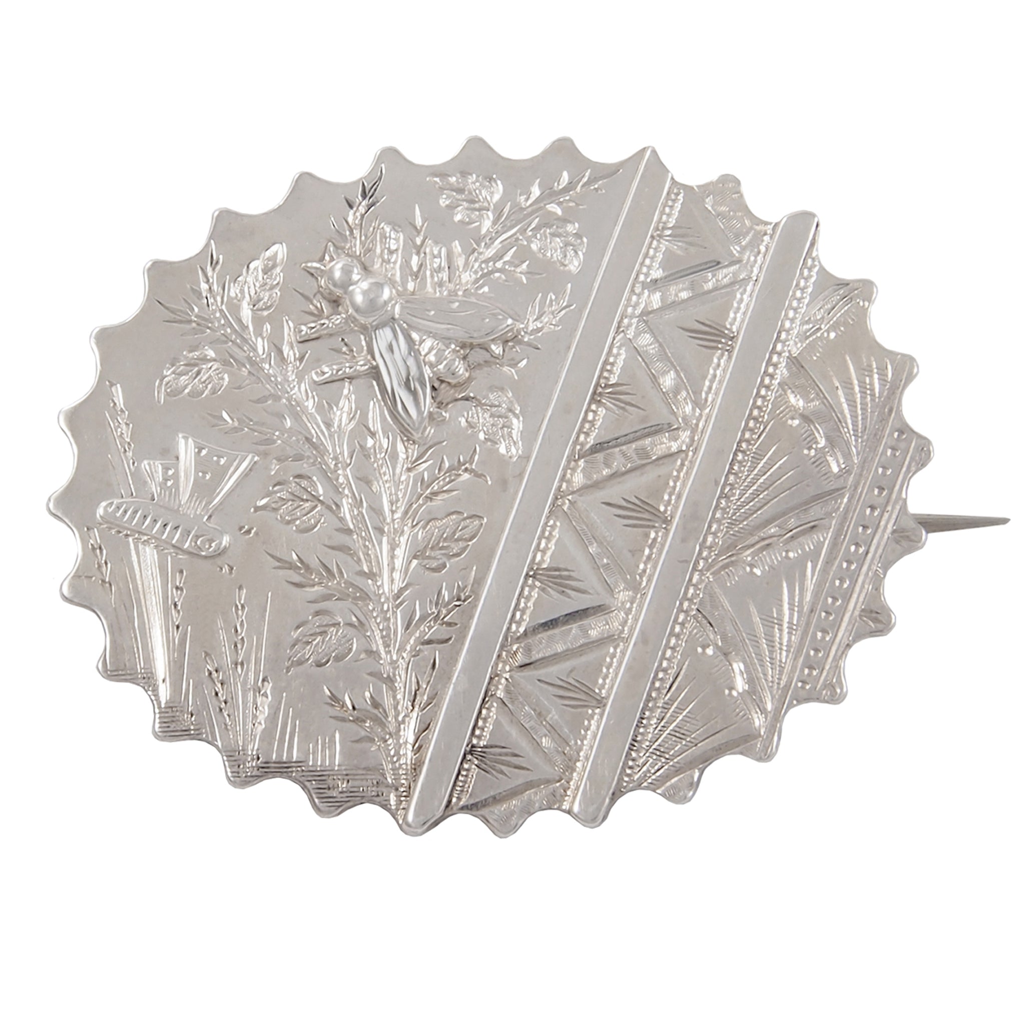 A Victorian, silver, engraved grass & insect oval brooch with a fitting for a photograph on the rear.