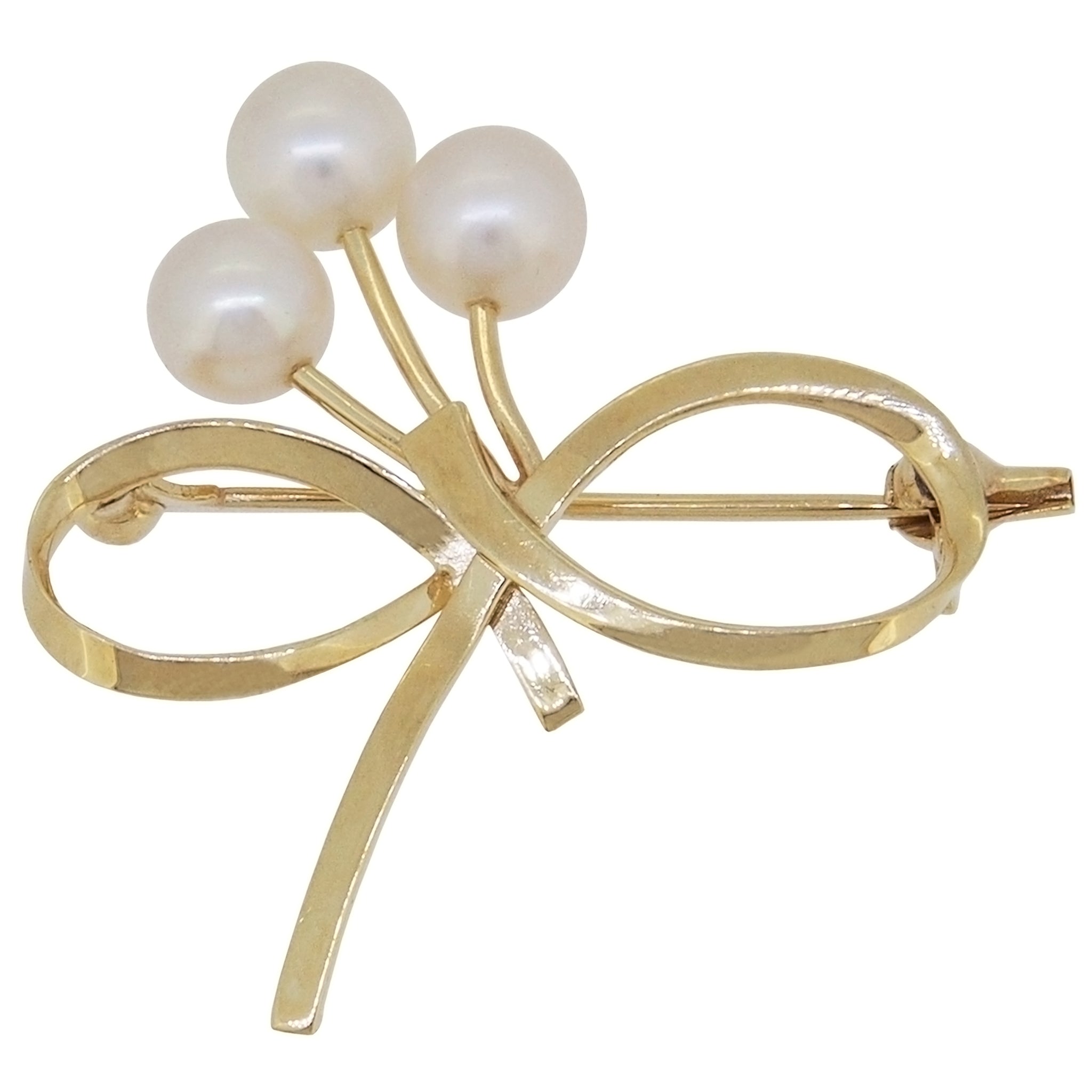 A mid-20th century, 14ct yellow gold, pearl set, three stone bow brooch.