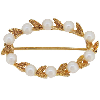 A mid-20th century, 9ct yellow gold, pearl set, ten stone, oval, open work, laurel leaf brooch.