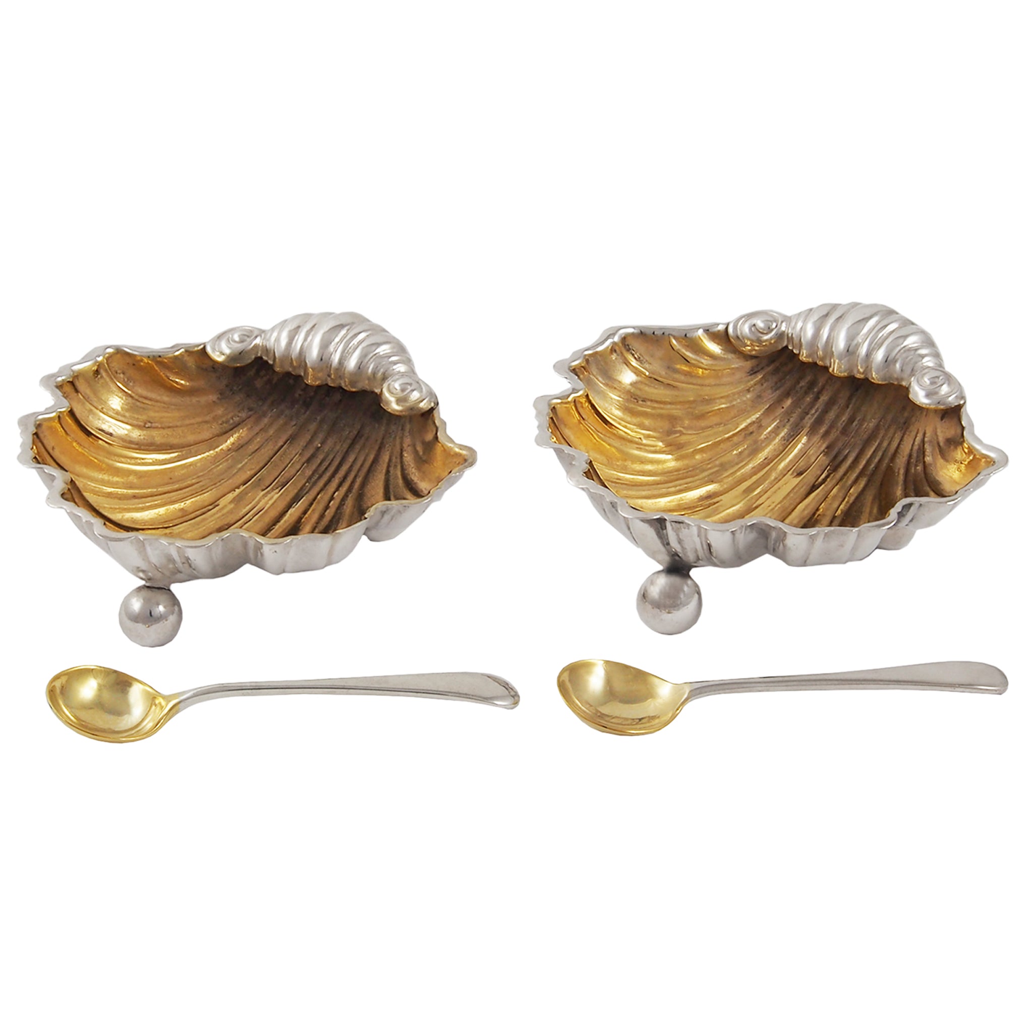 A pair of Victorian, silver & silver gilt, open shell salts & spoons & fitted case.