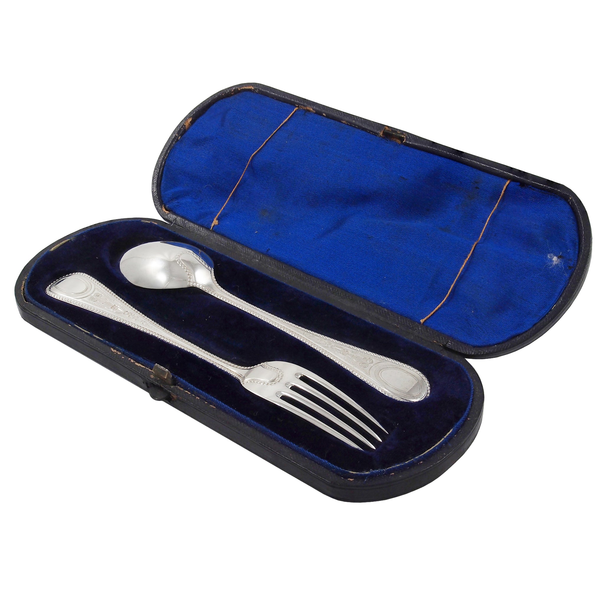 A Victorian, silver, child's fork & spoon & fitted case.