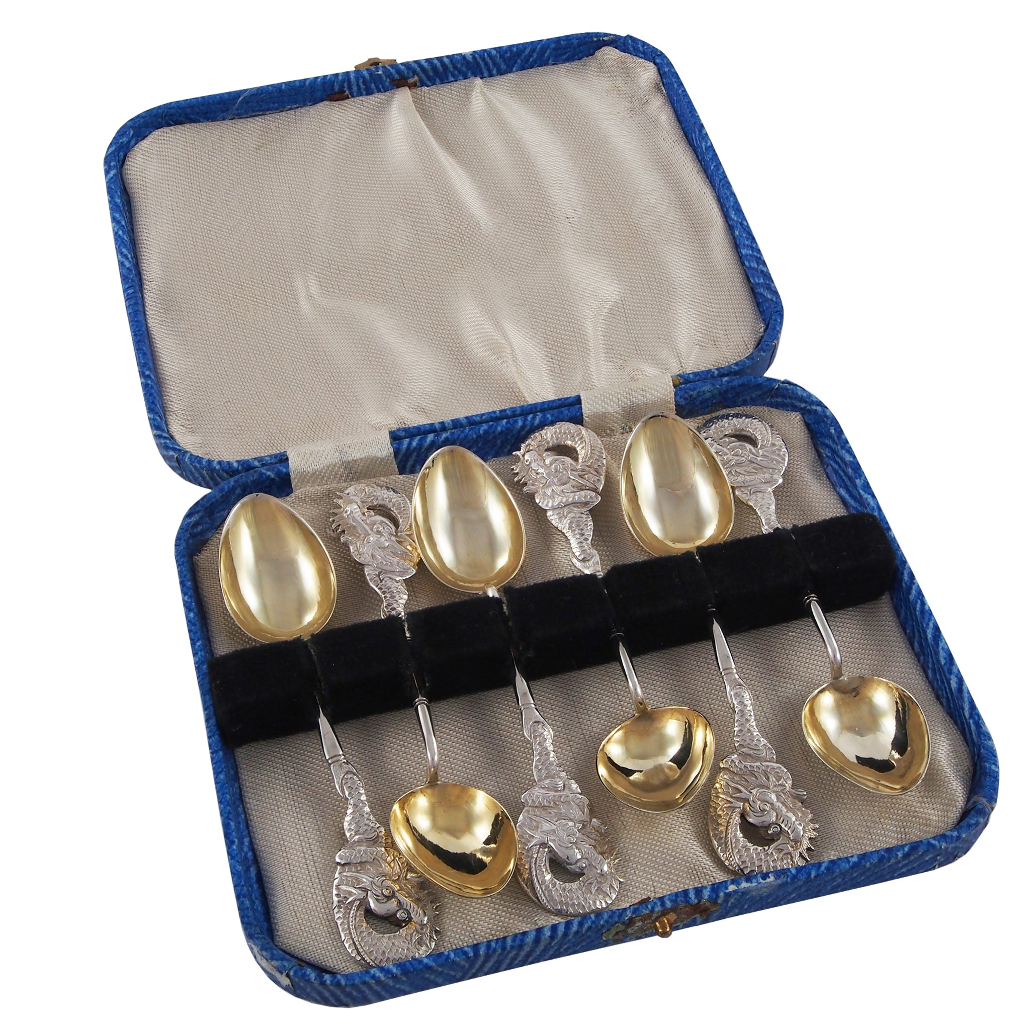 Six mid-20th century, silver, spoons with silver gilt bowls & a dragon at each terminal end & fitted case.