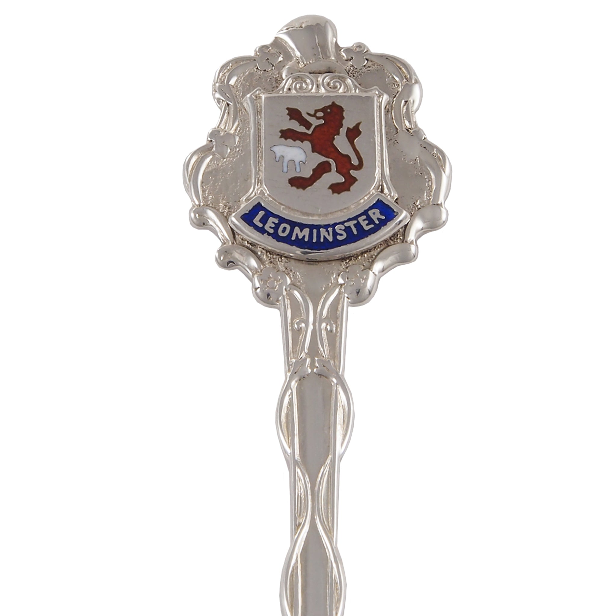 A mid-20th century, silver, enamel set souvenir teaspoon featuring a crest of Leominster on the terminal end.