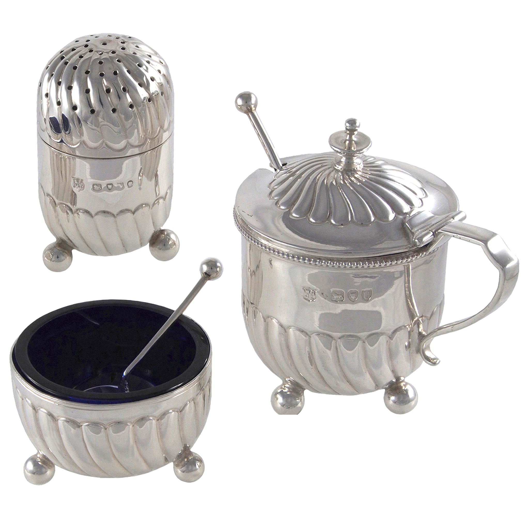 Includes an open salt with a spoon & blue glass liner, a pepper & mustard with a spoon & blue glass liner.