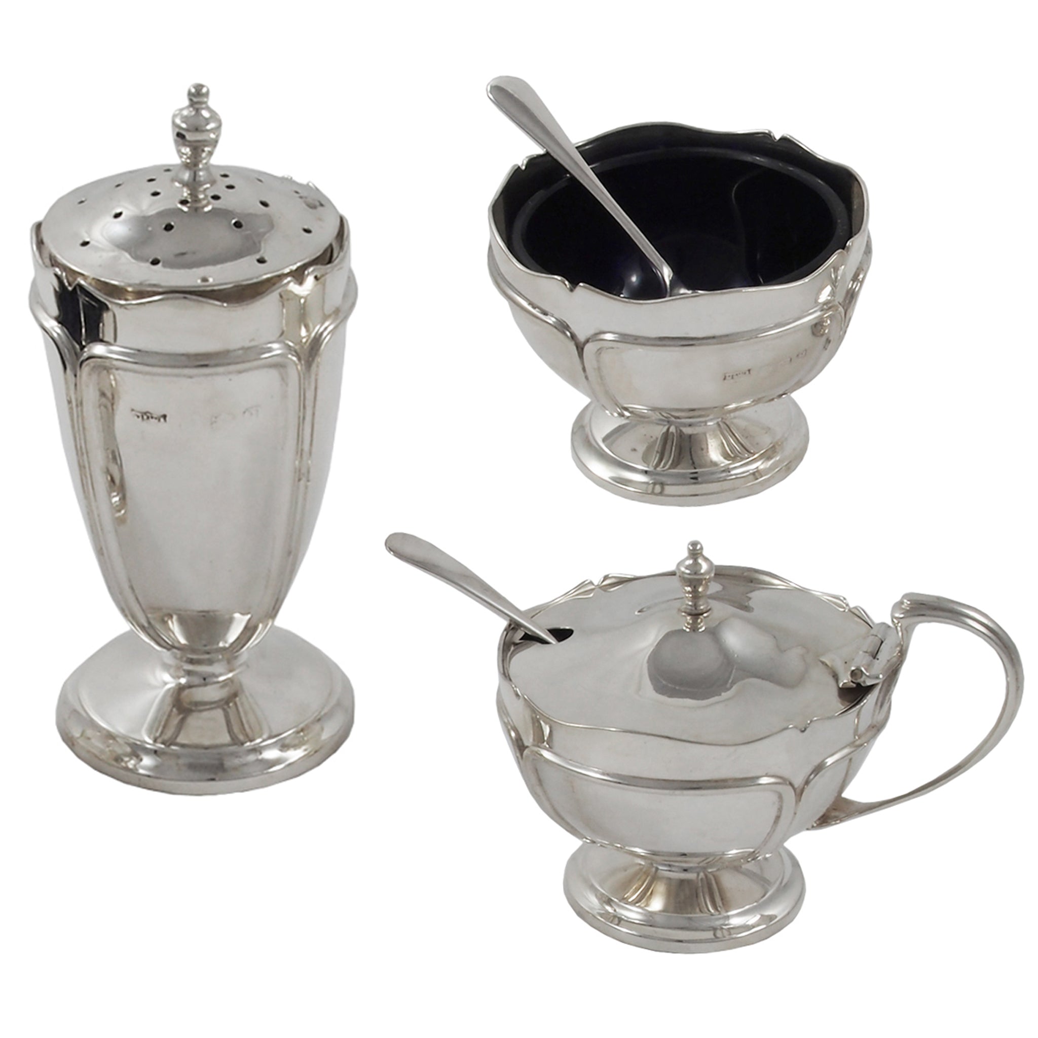 Includes a mustard pot with blue glass liner & spoon, an open salt with blue glass liner & spoon & pepper pot.