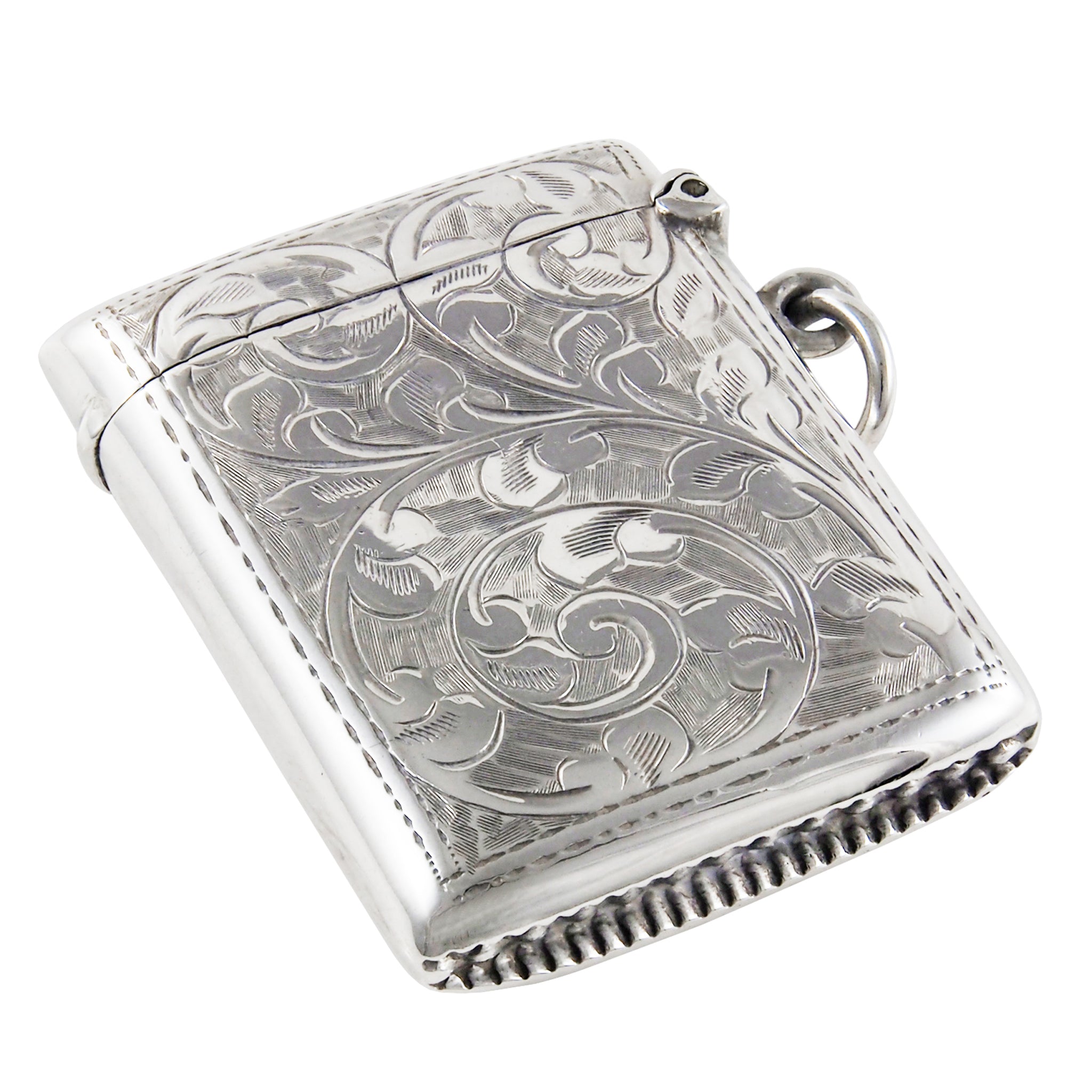 An Edwardian, silver vesta case with a vacant shield cartouche on the front & a floral design on the front & rear.