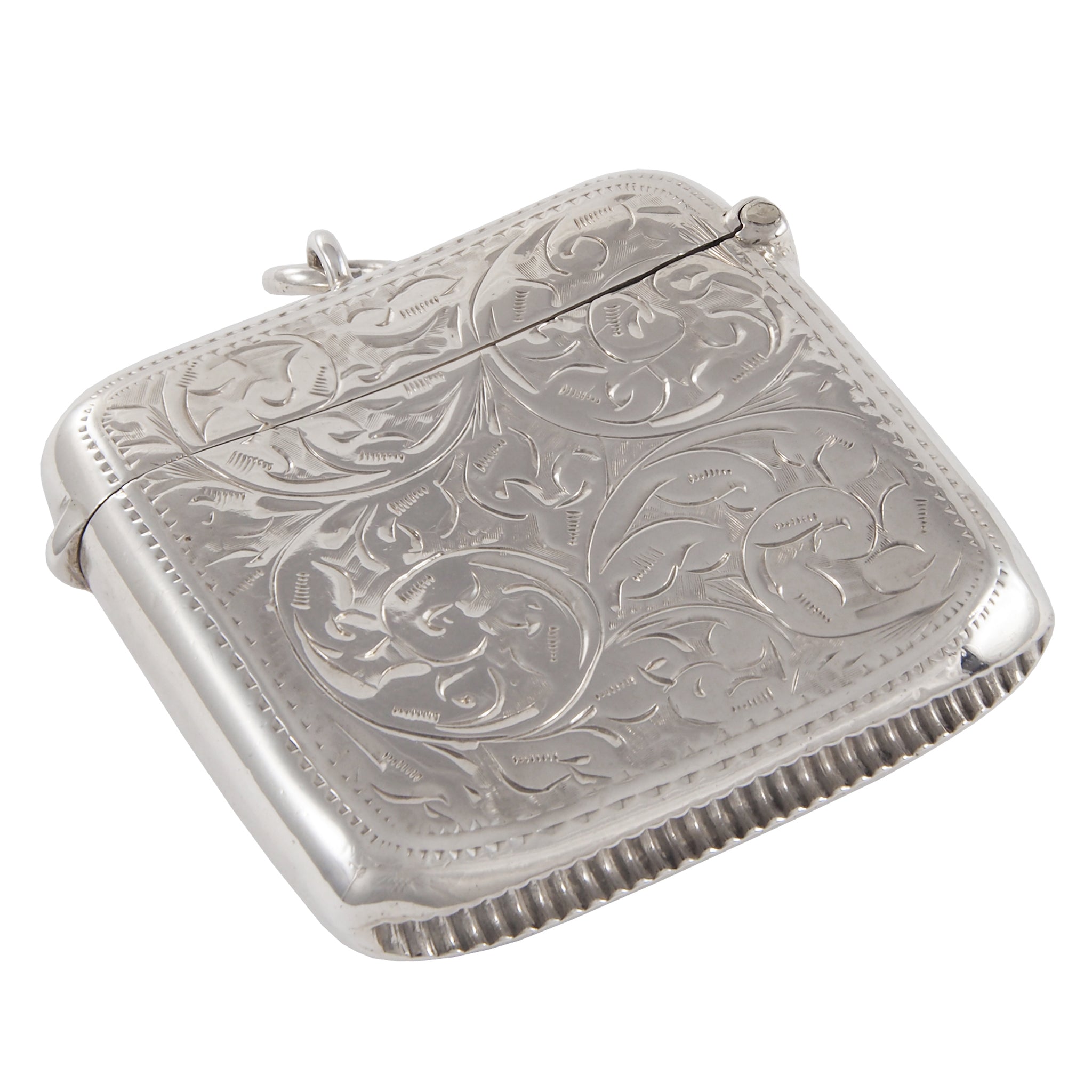 An Edwardian, silver, curved vesta case with a vacant circular cartouche & floral decoration front & back.