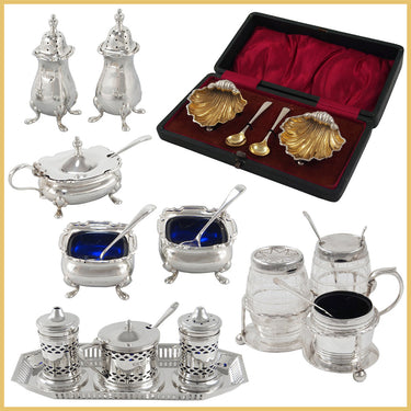 Enhance your dining experience with our Condiments & Cruets collection, featuring a variety of Antique, Traditional, Vintage & Modern pieces. From silver salt & pepper shakers to elegant oil & vinegar sets, these items combine functionality with fine craftsmanship, adding a touch of luxury to your dining table.