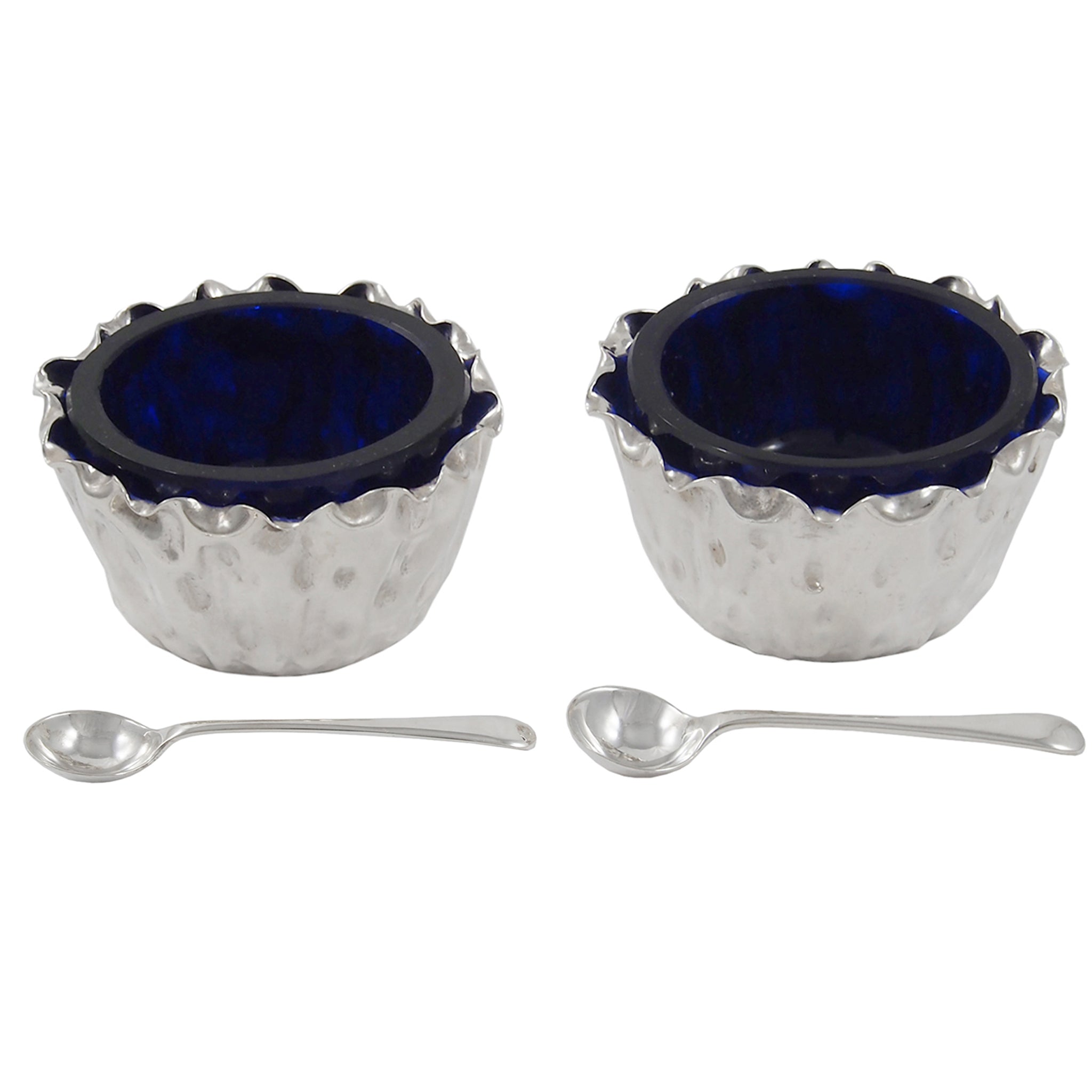 A pair of Victorian, silver open salts with blue glass liners & spoons.
