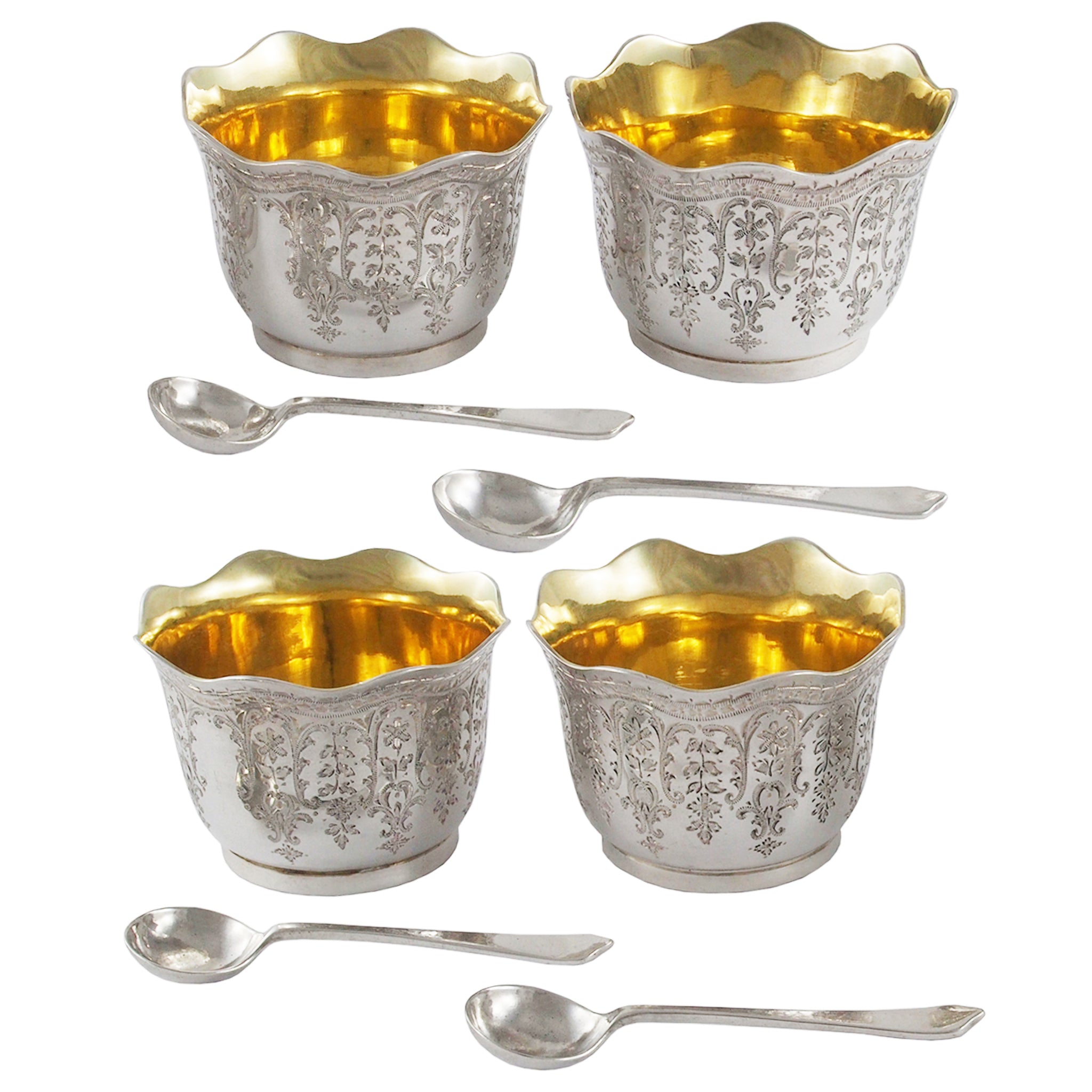 Four Victorian, silver open salts with gilt interiors & four spoons.
