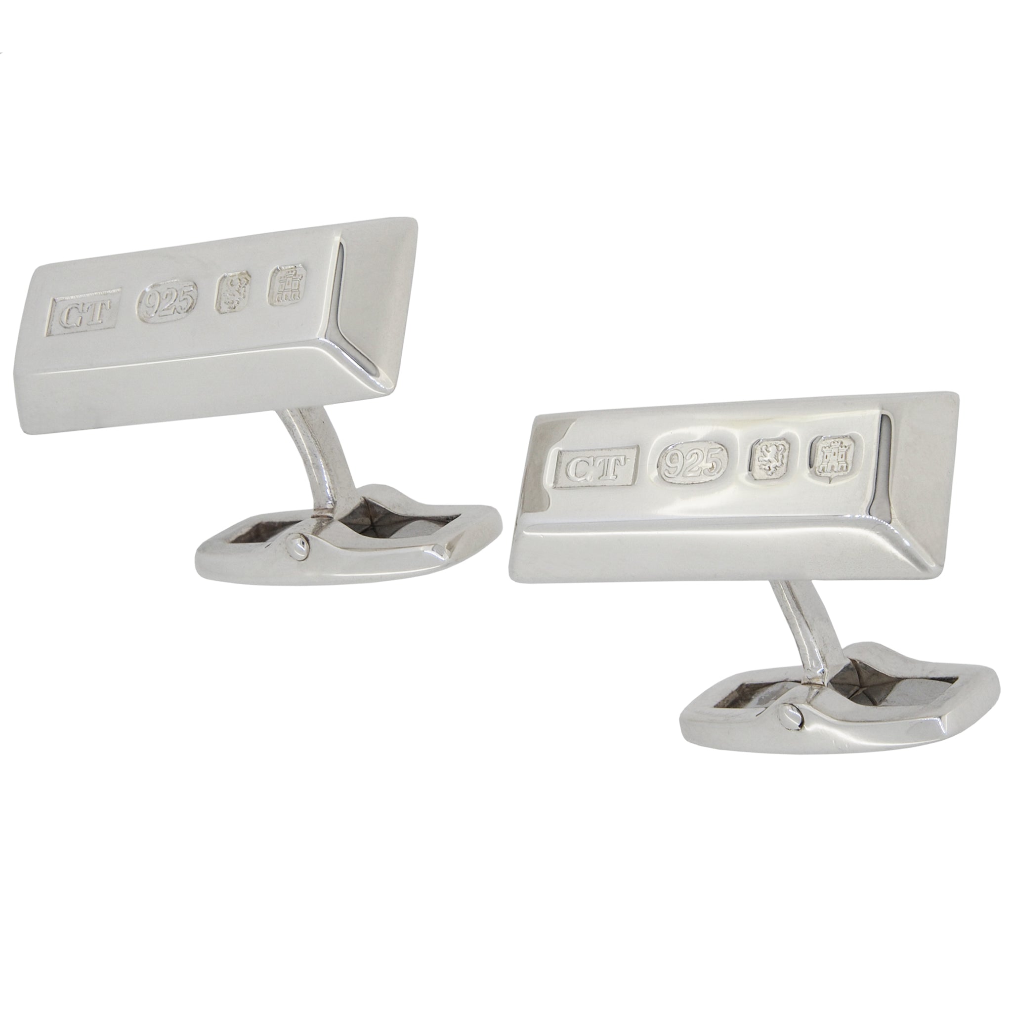 A pair of modern, silver, oblong, ingot, bar link cufflinks with featured hallmarks.