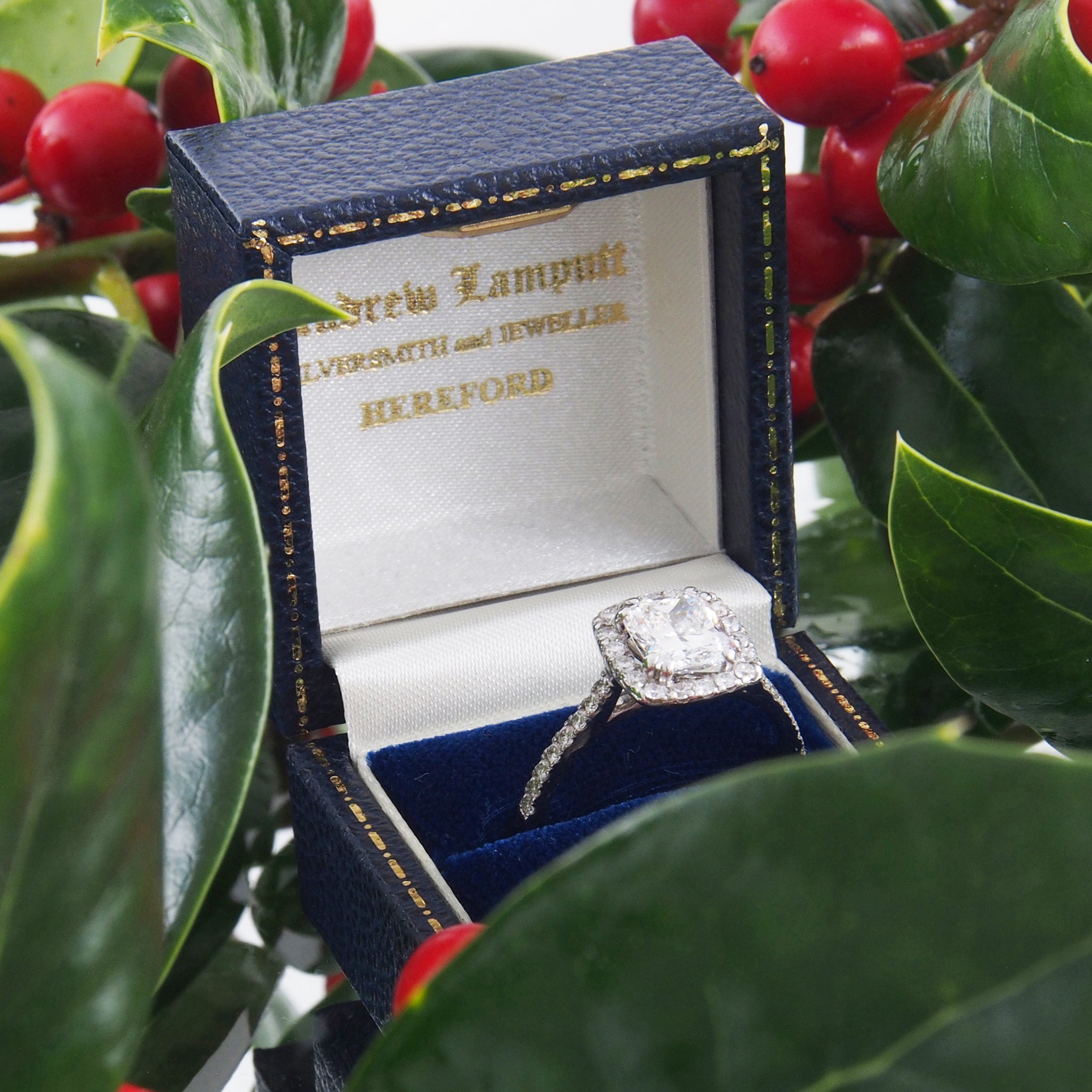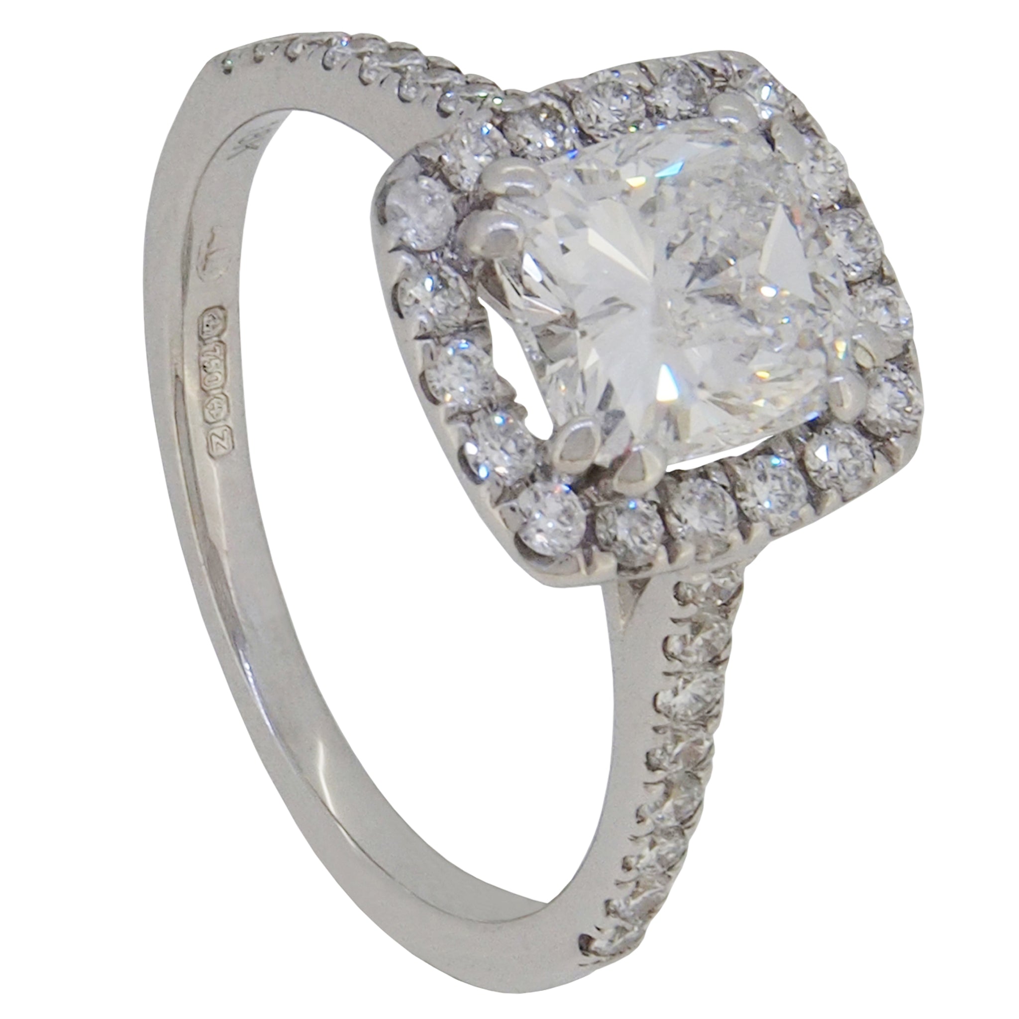 A modern, 18ct white gold, cushion cut diamond set, halo cluster ring.