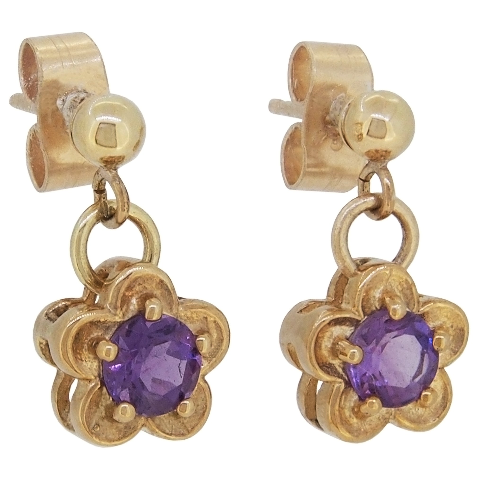 A pair of modern, 9ct yellow gold, amethyst set floral drop earrings.