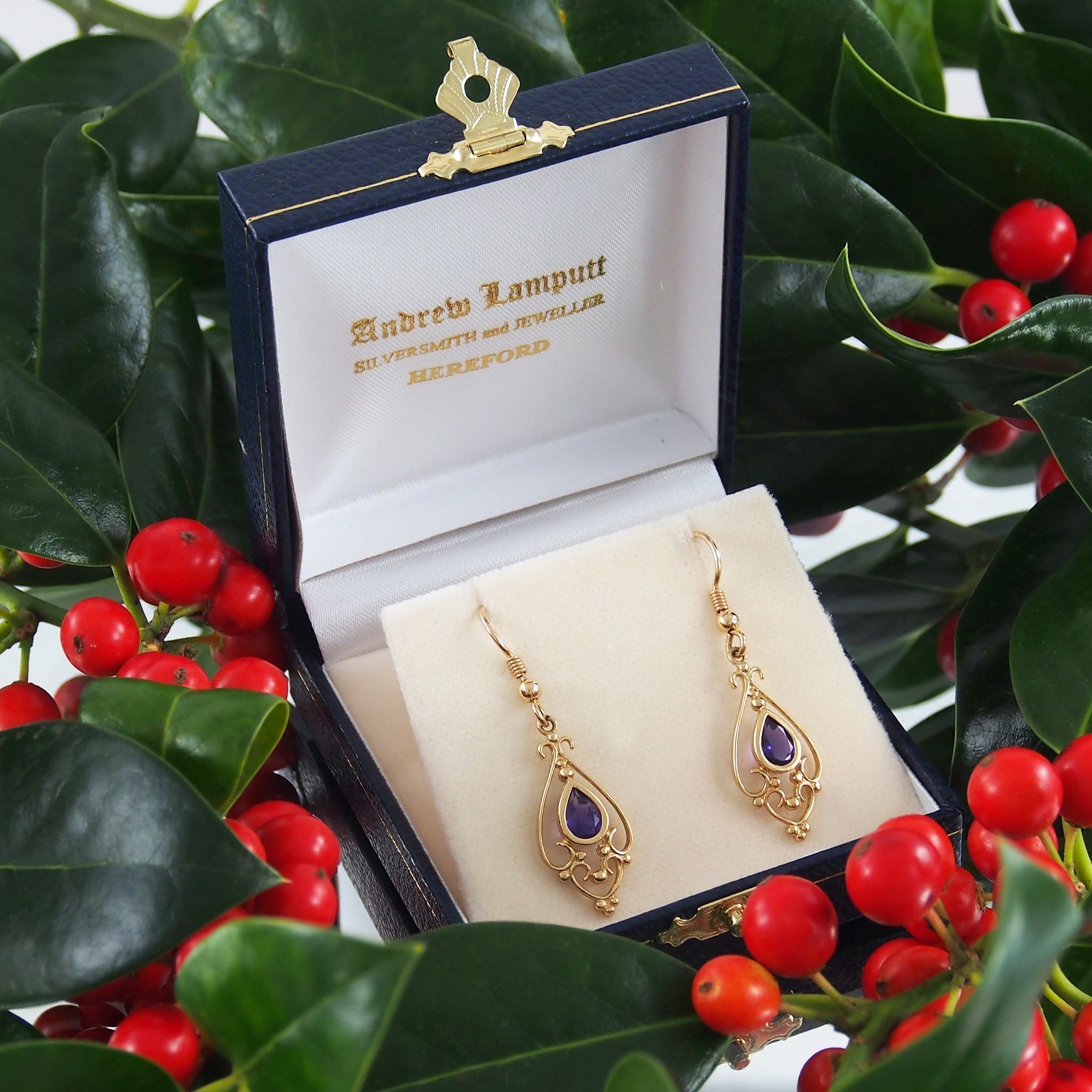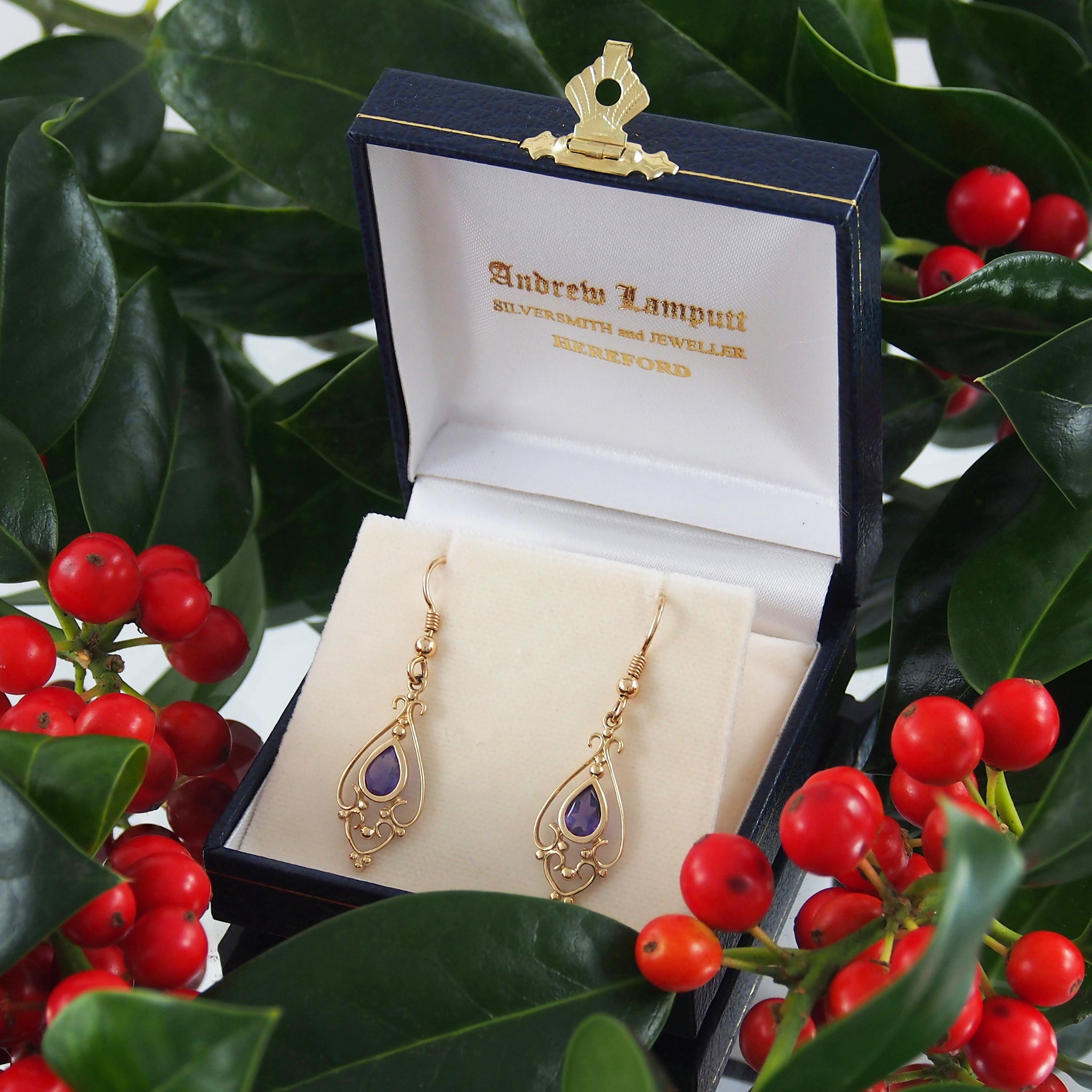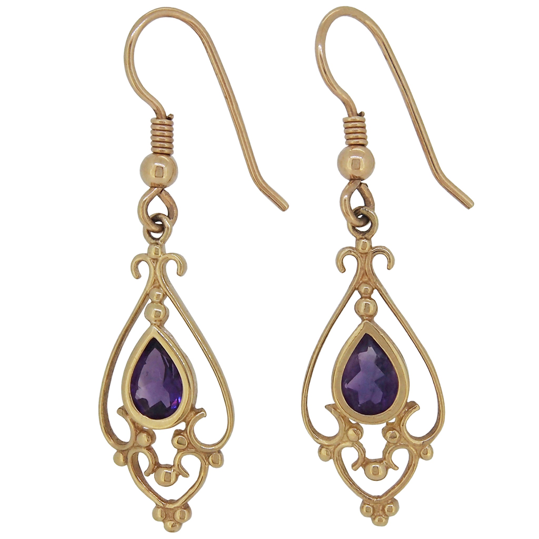 A pair of modern, 9ct yellow gold, amethyst set drop earrings.