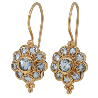 A pair of modern, 9ct yellow gold, aquamarine set cluster drop earrings.