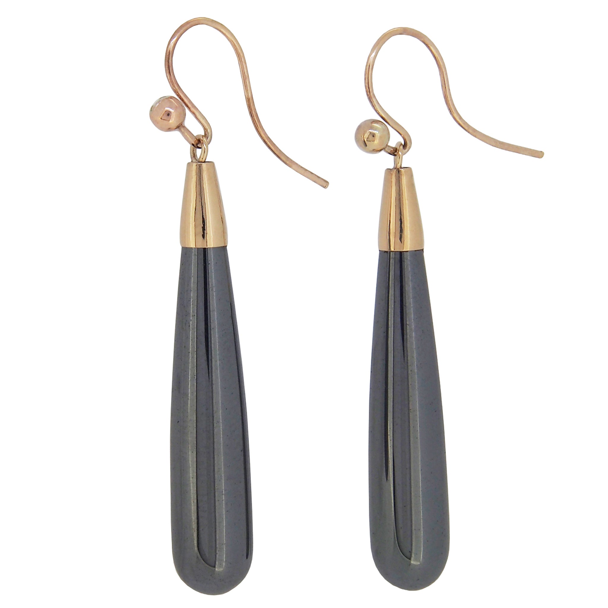 A pair of modern, 9ct yellow gold, hematite set drop earrings.