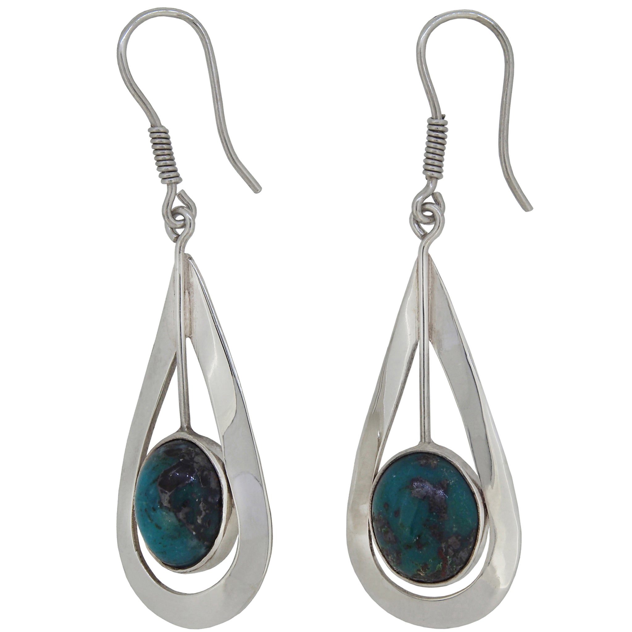 A pair of modern, silver, turquoise matrix set drop earrings.