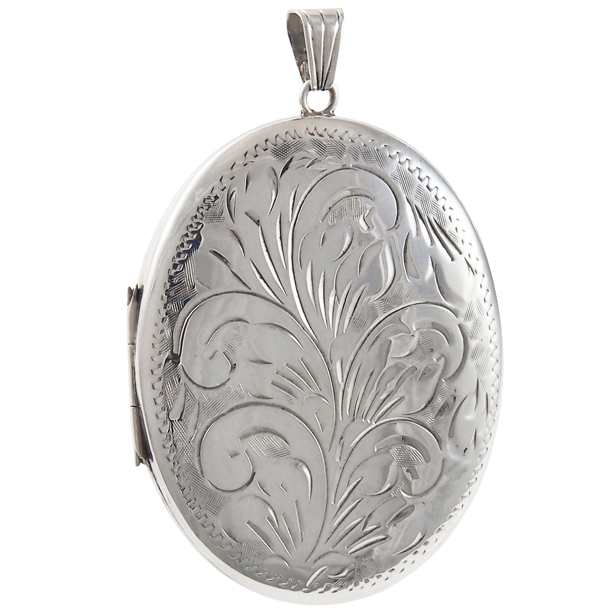 A modern, silver, engraved, oval locket.