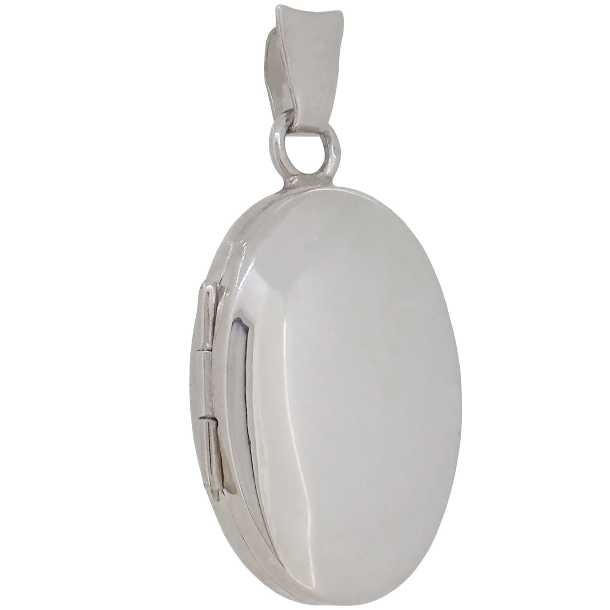 A modern, silver, plain, oval locket.