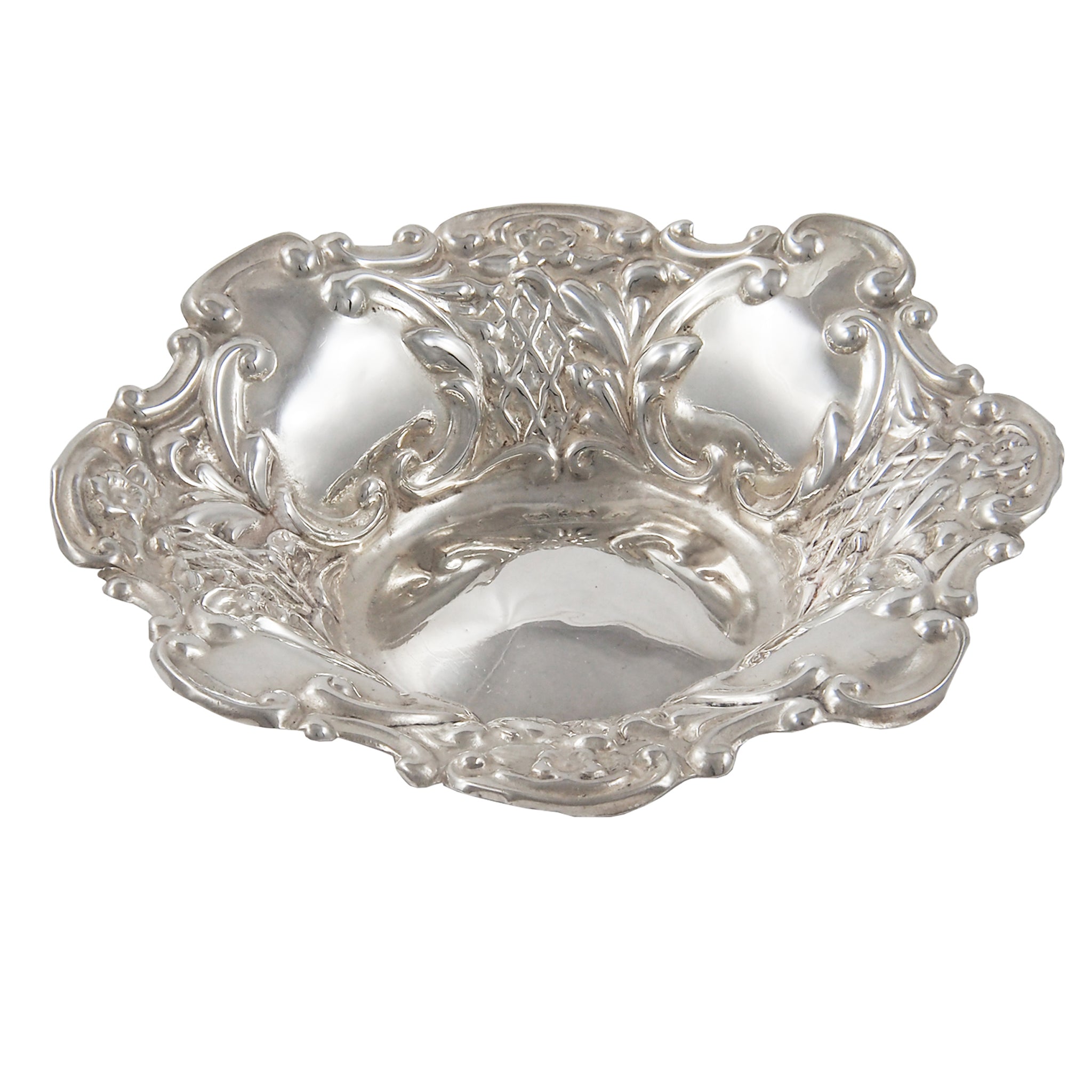 An Edwardian, silver, circular, embossed bon bon dish.
