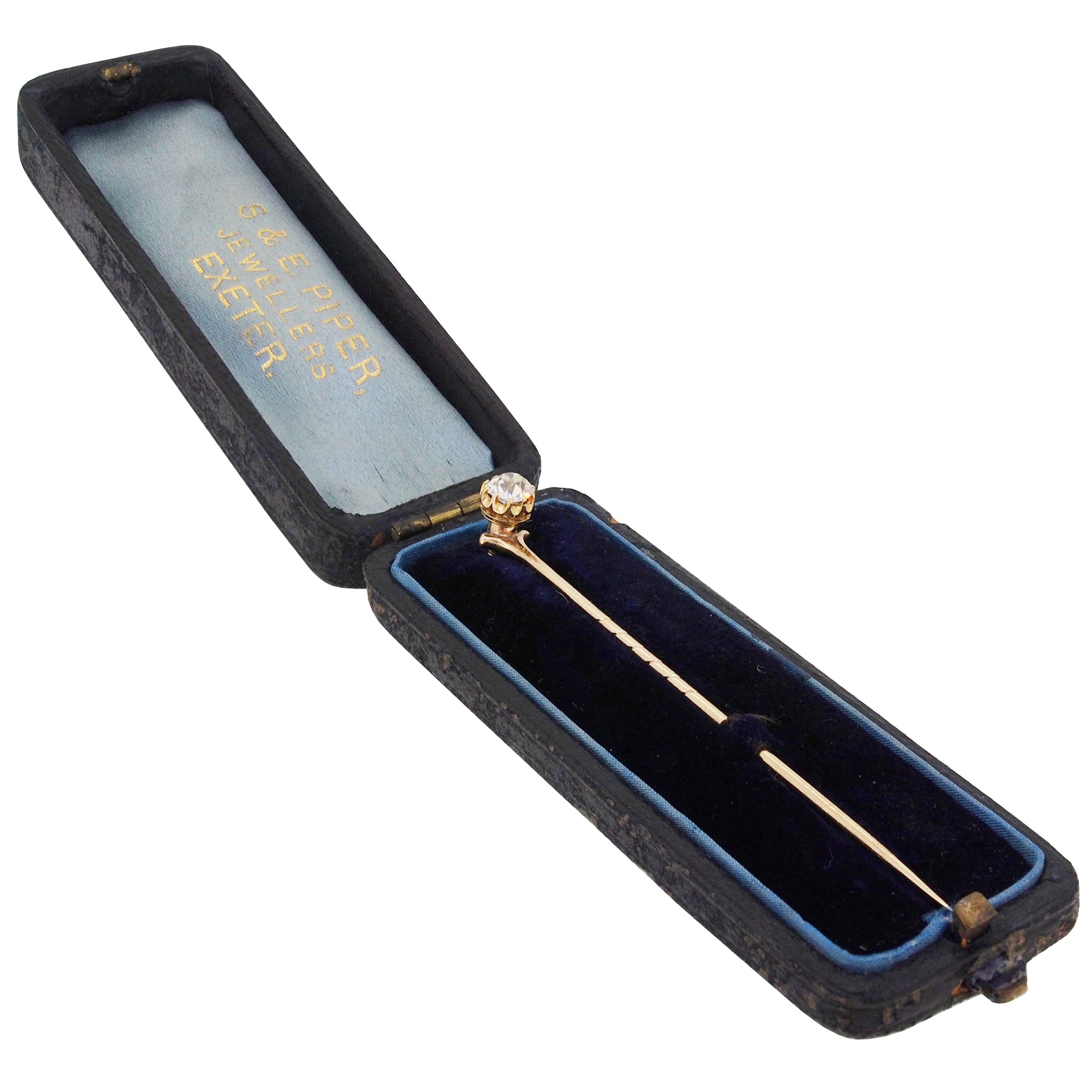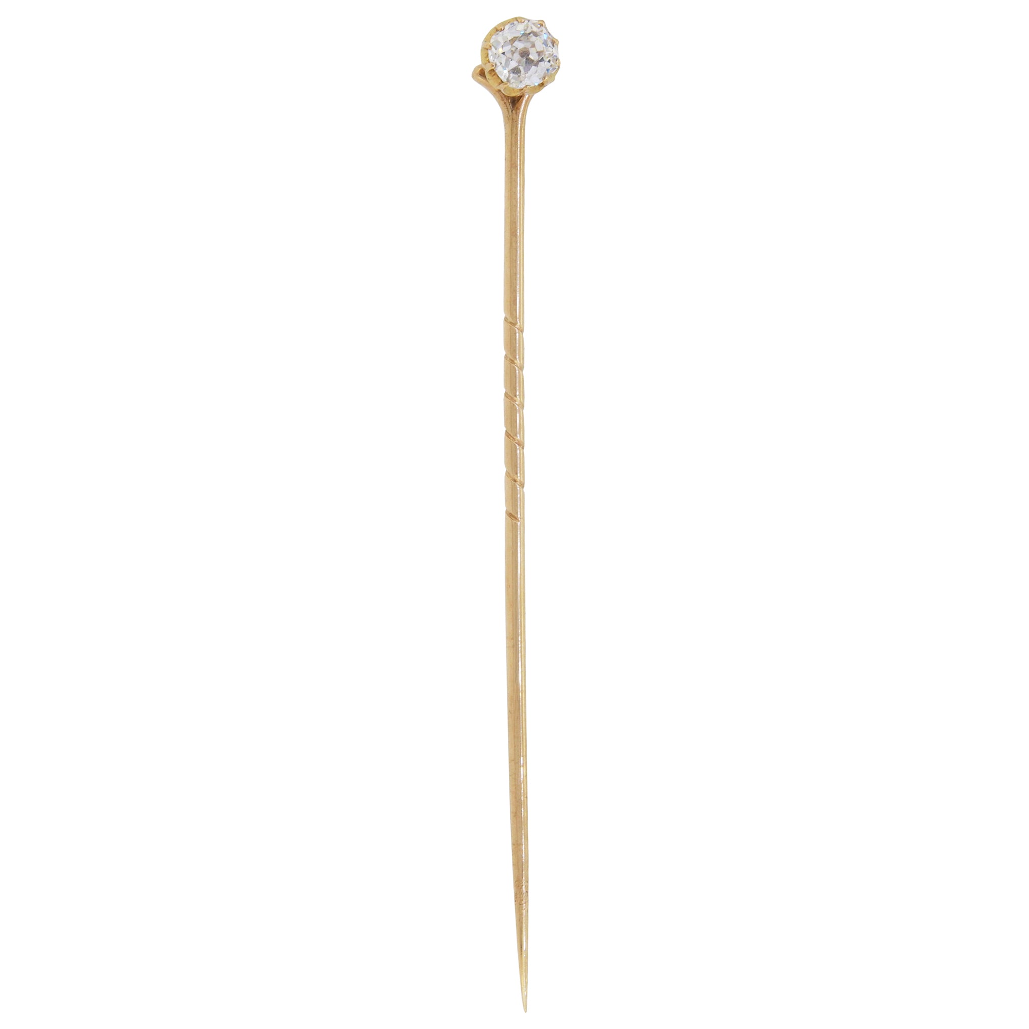 An Edwardian, yellow gold, old fashioned brilliant cut diamond set stick pin & fitted case.