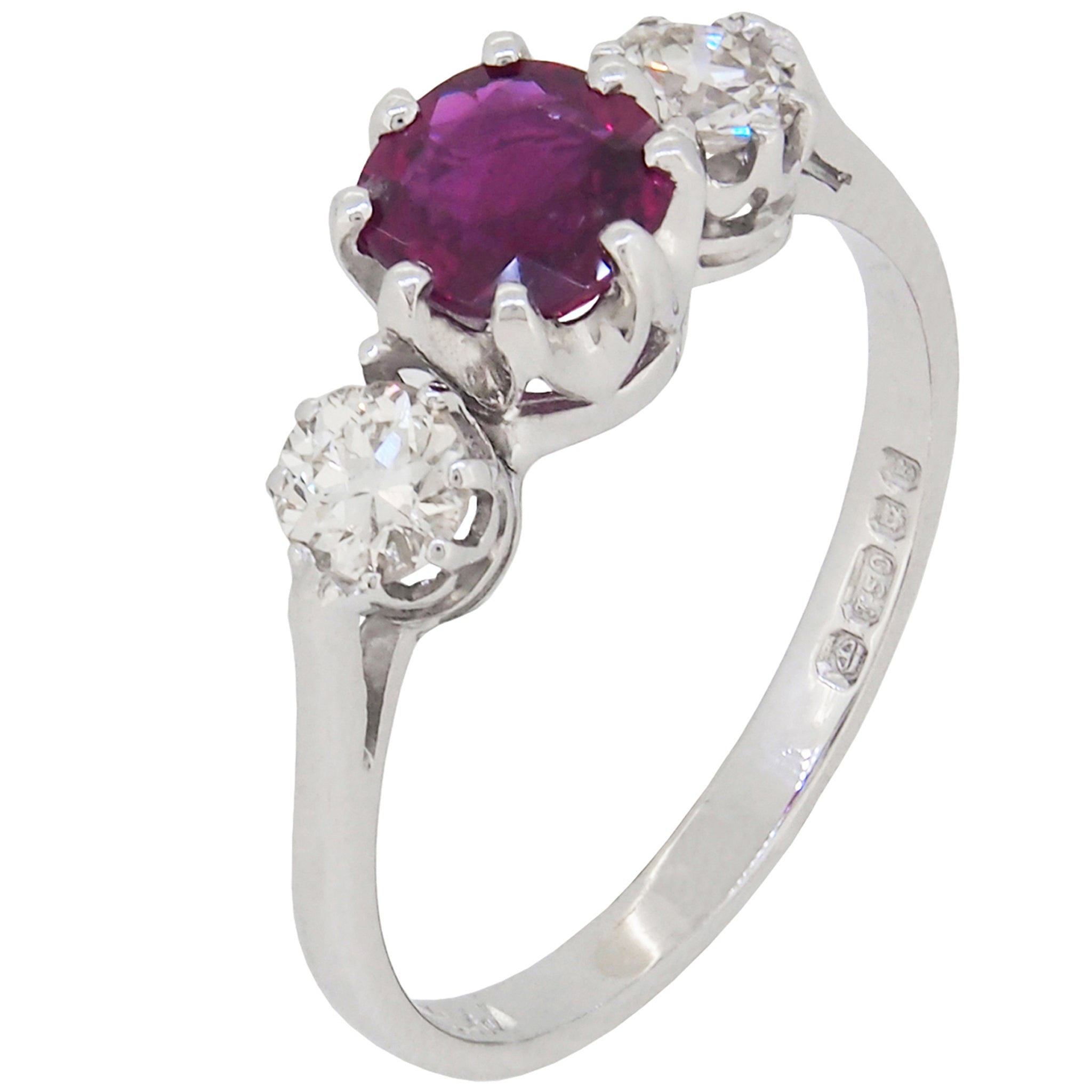 A mid 20th century, 18ct white gold, ruby & diamond set, three stone ring.