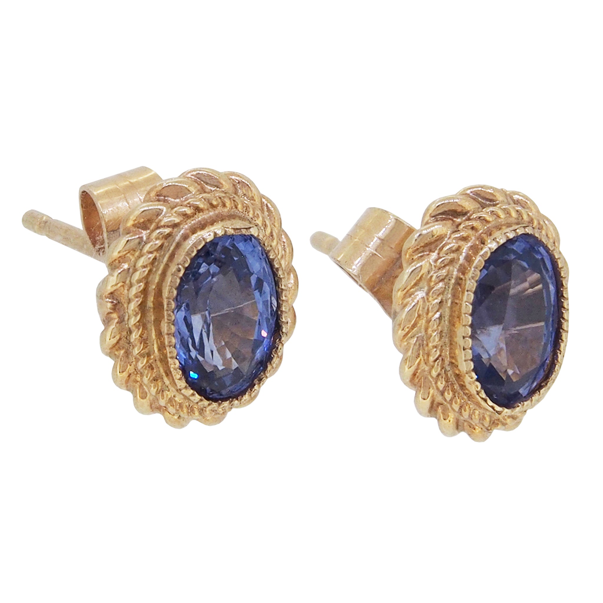 A pair of modern, 9ct yellow gold, aquamarine set stud earrings with a cord border.