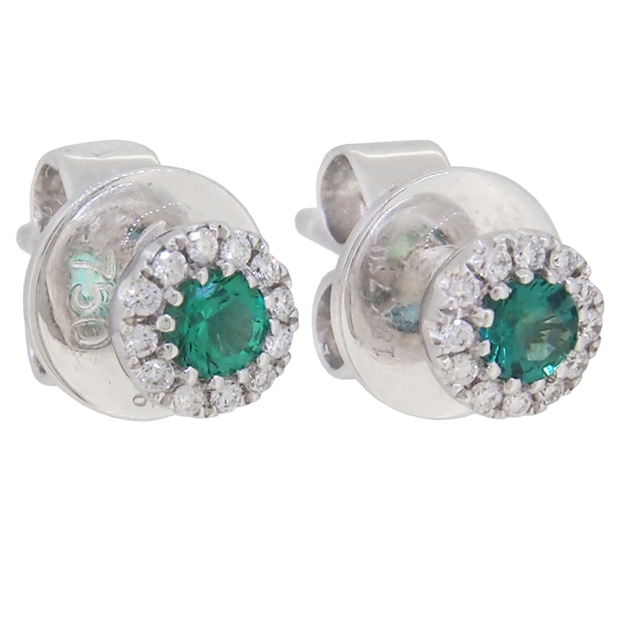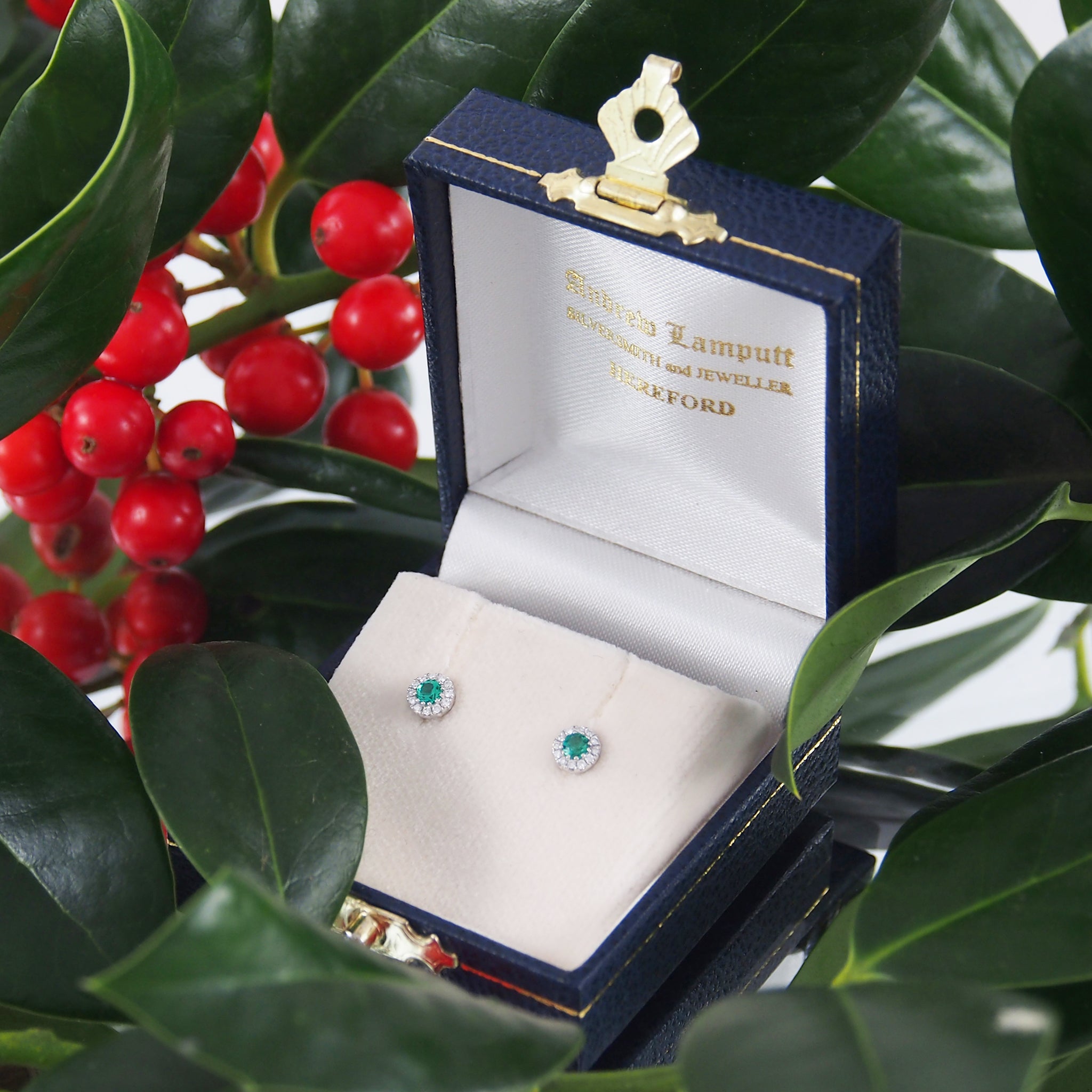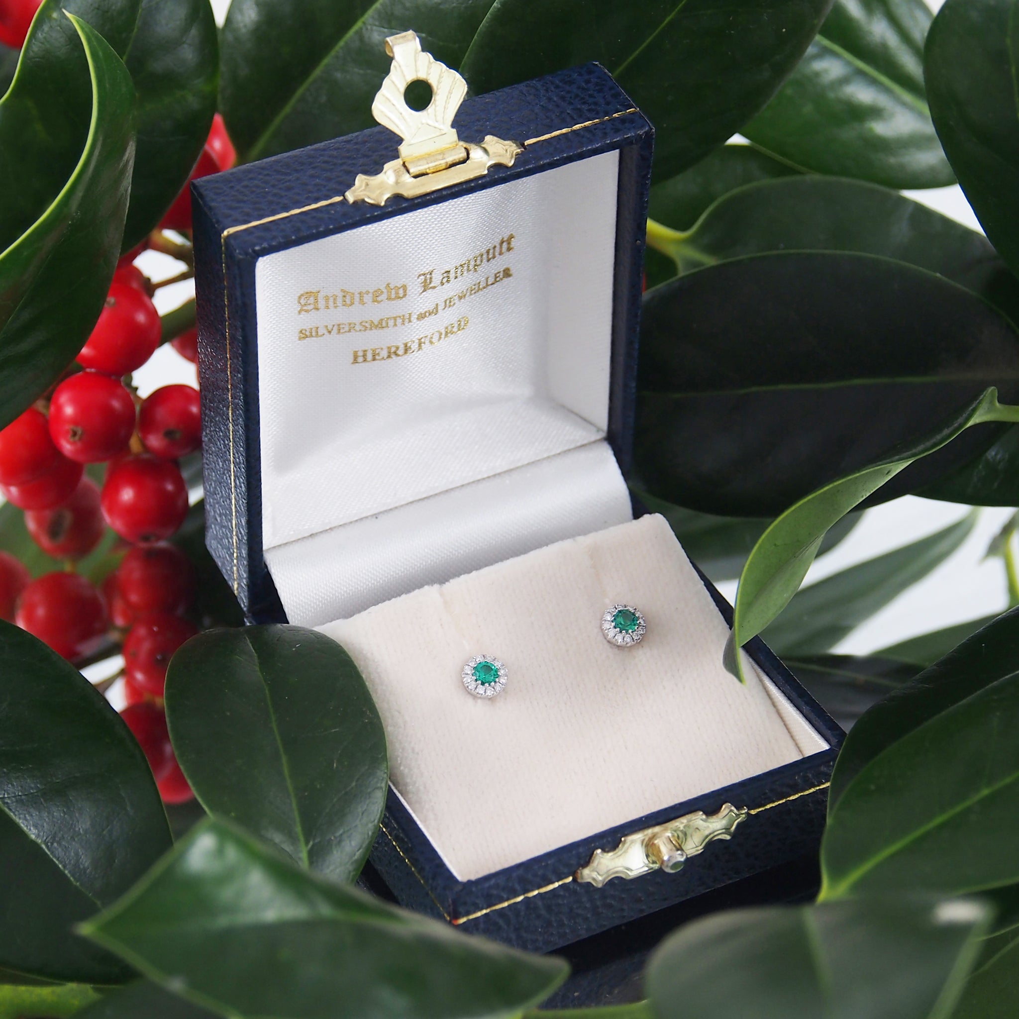 A pair of modern, 18ct white gold, emerald & diamond set cluster stud earrings.