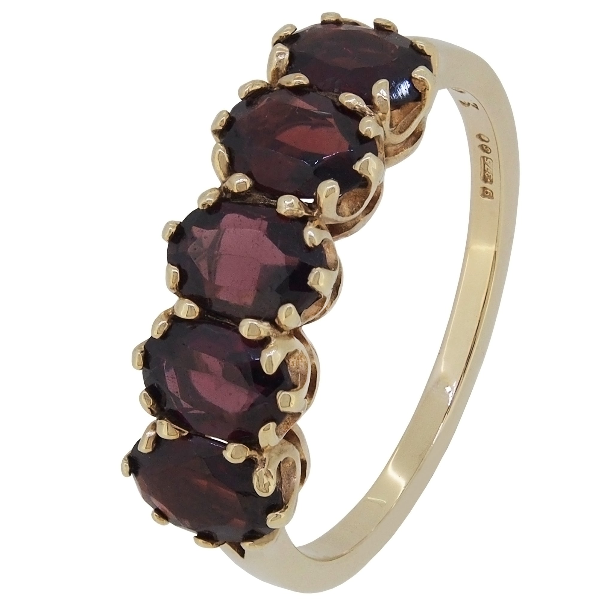 A modern, 9ct yellow gold, garnet set, five stone half hoop ring.