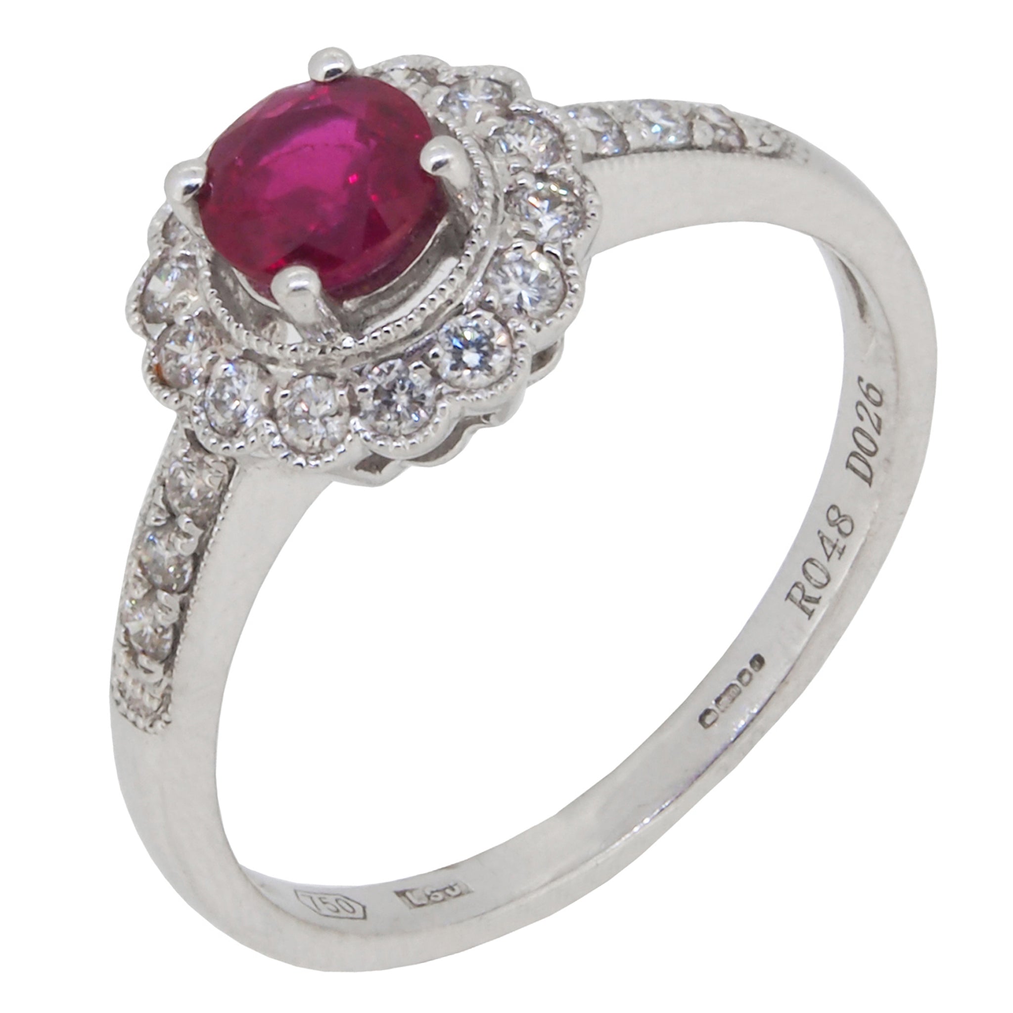 A modern, 18ct white gold, ruby & diamond set cluster ring with diamond set shoulders.