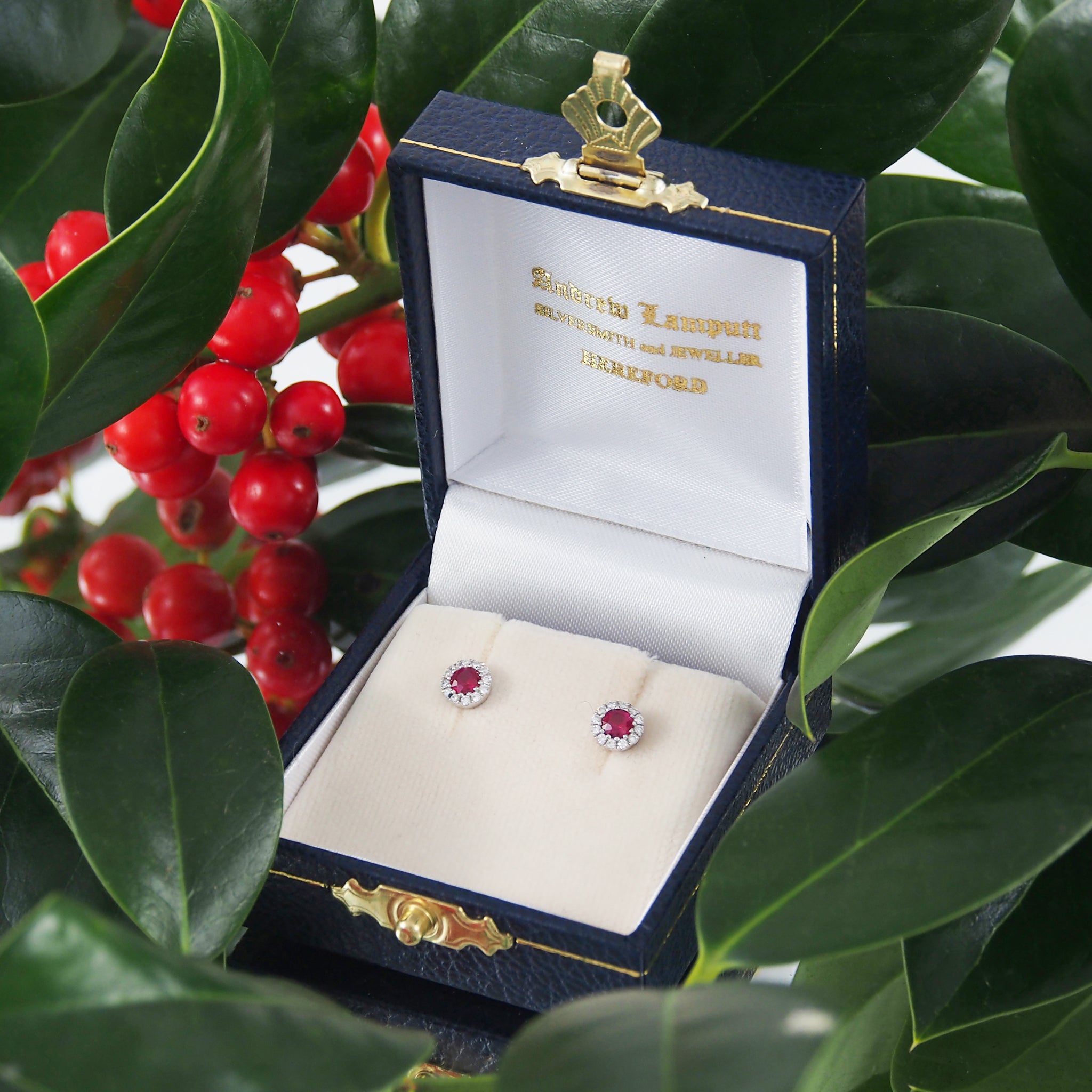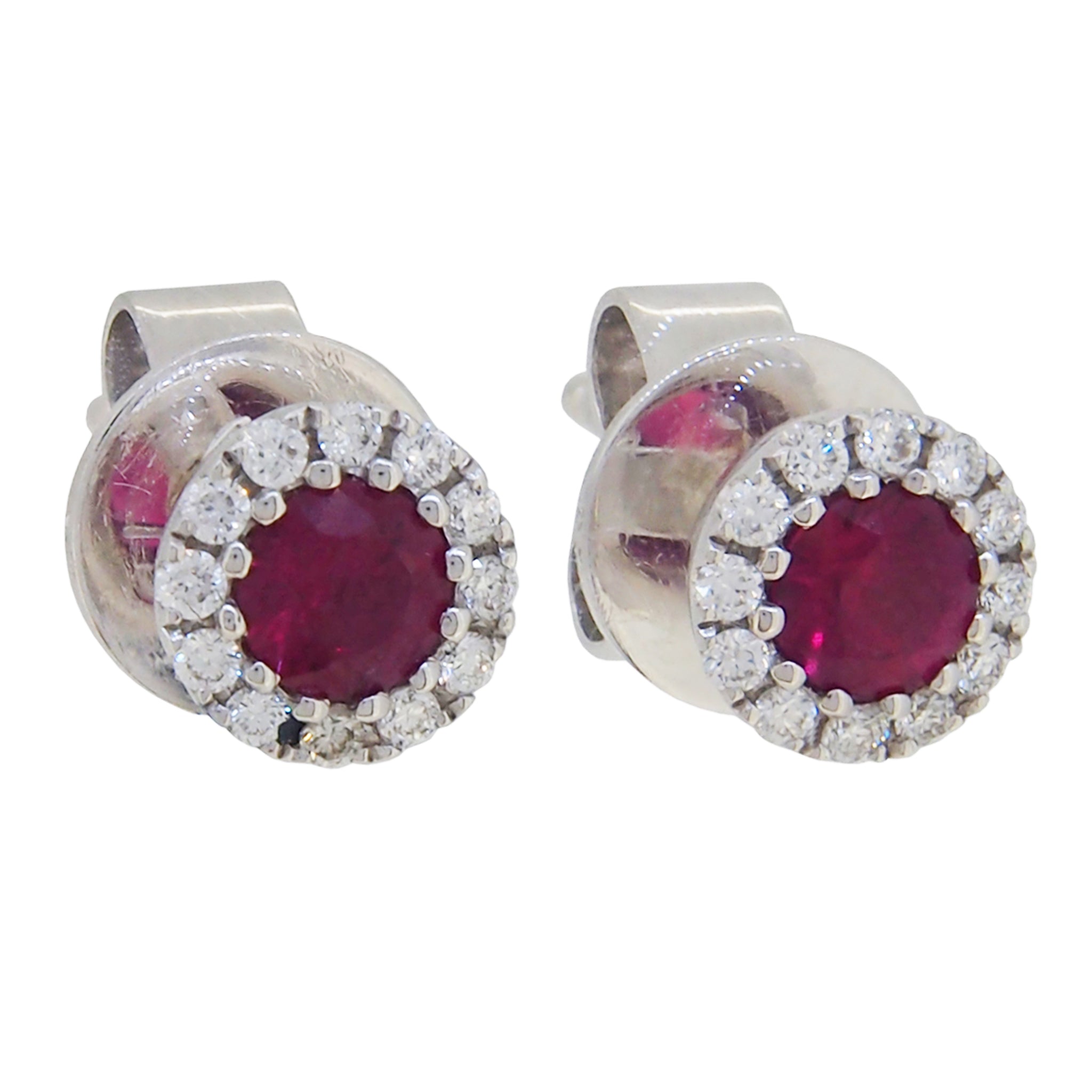 A pair of modern, 18ct white gold, ruby & diamond set cluster stud earrings.