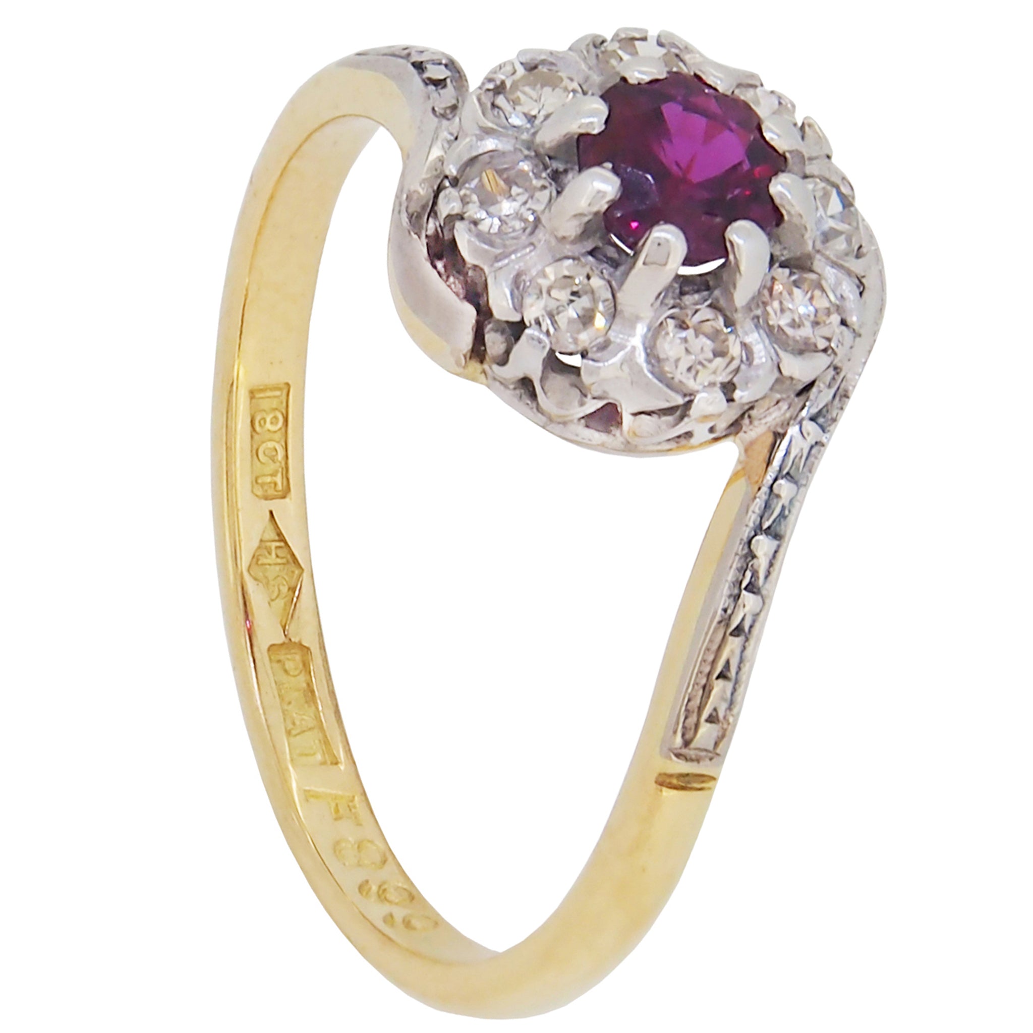 A mid-20th century, 18ct yellow gold & platinum, ruby & diamond set cluster crossover ring.