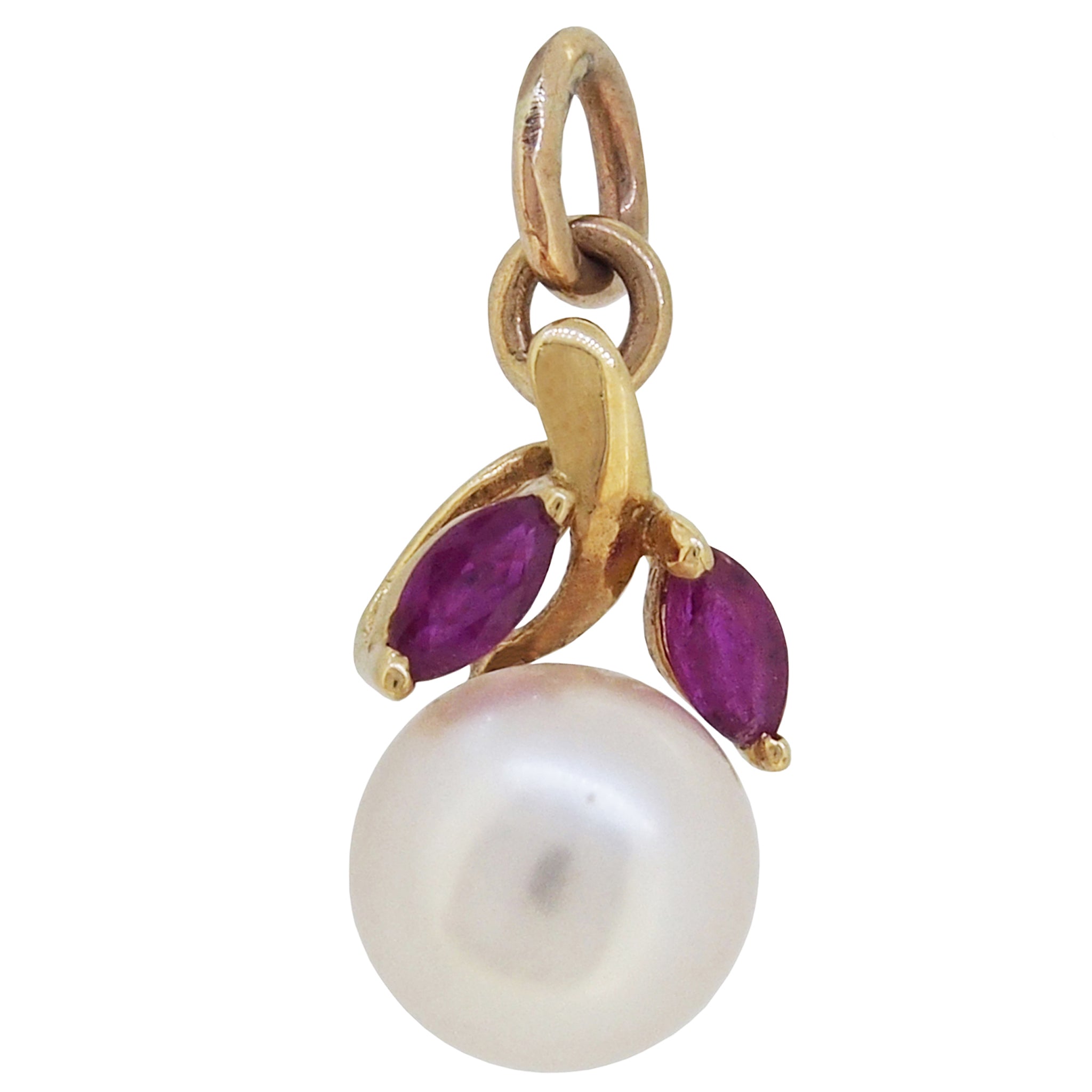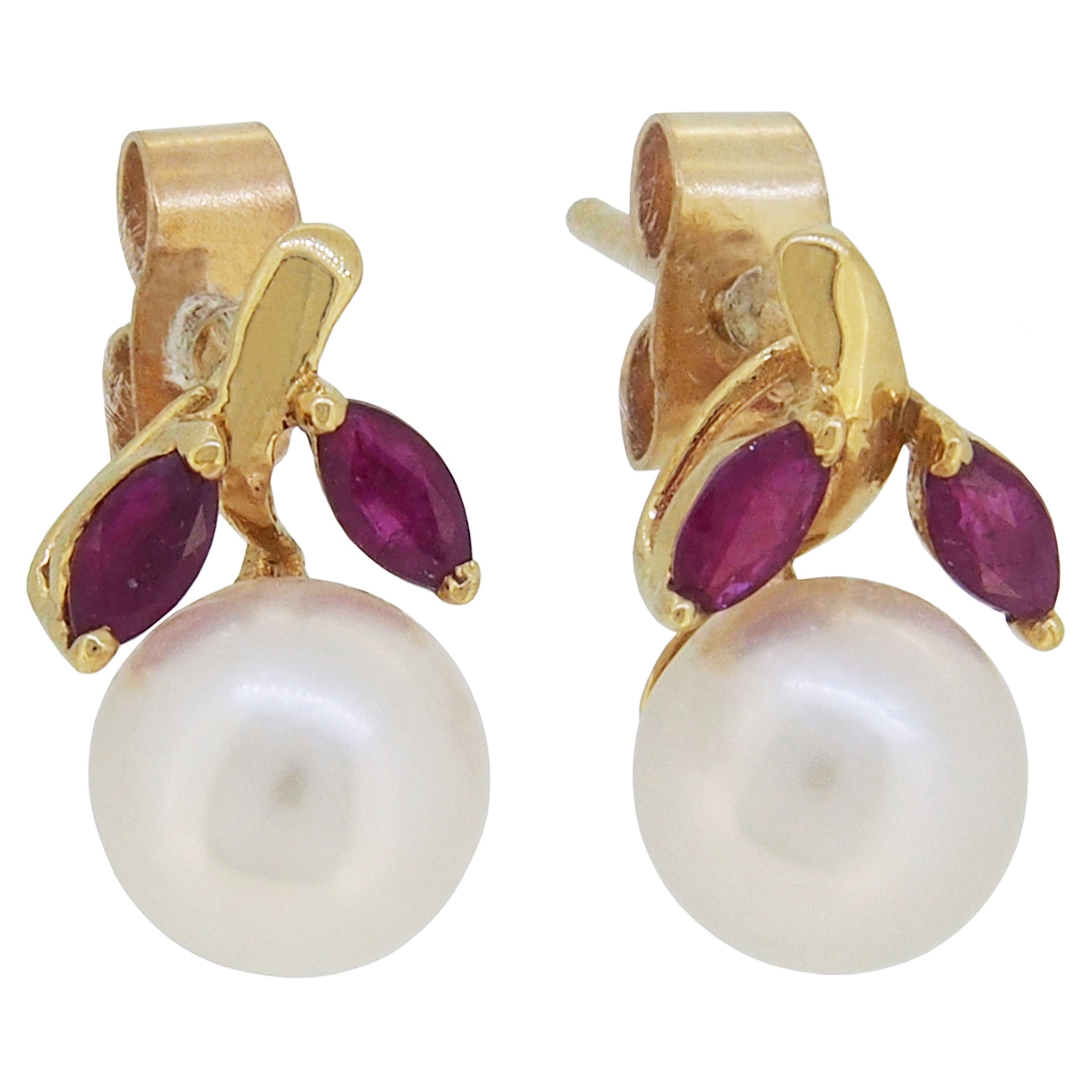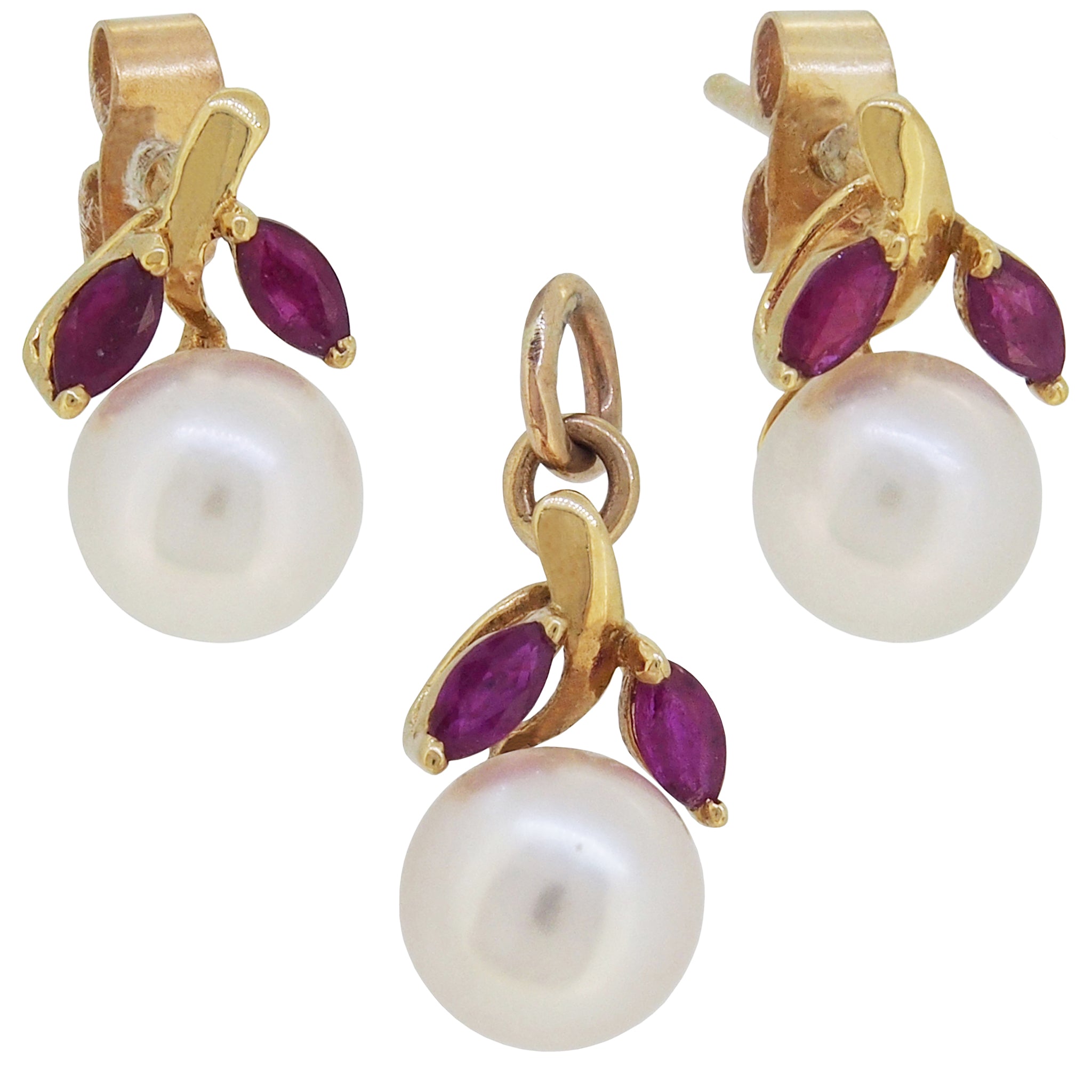 A pair of modern, 18ct yellow gold, ruby & pearl set stud earrings & matching pendant.