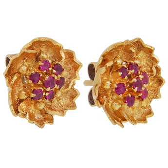 A pair of mid-20th century, 18ct yellow gold, ruby set, floral, cluster stud earrings.
