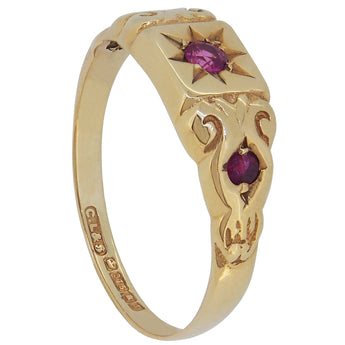 A modern, 9ct yellow gold, ruby, star set, three stone ring.