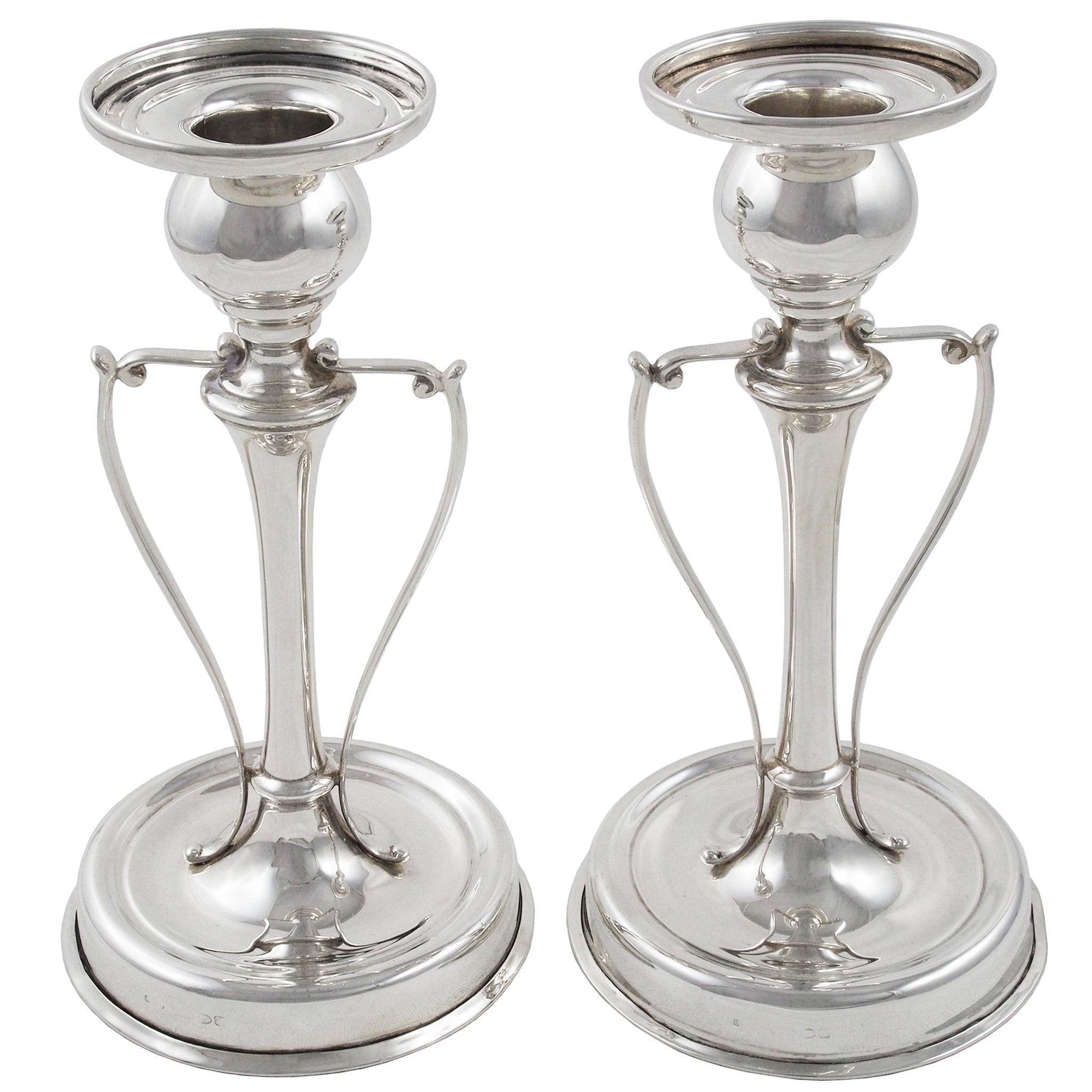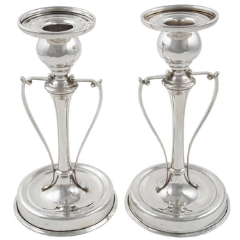 A pair of Edwardian, silver candlesticks with side handles.
