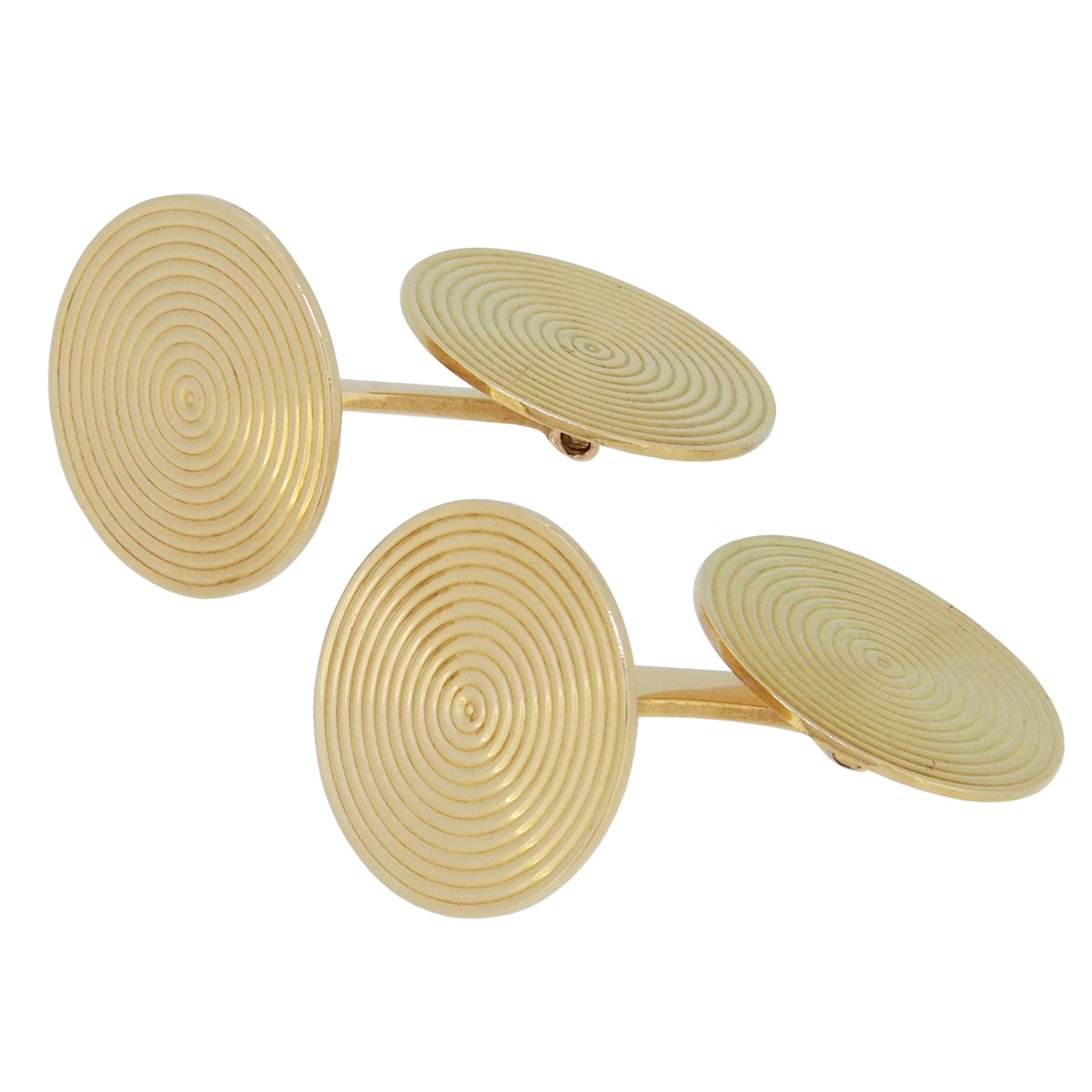 A pair of mid-20th century, yellow gold, circular, bar link cufflinks with concentric circles design.