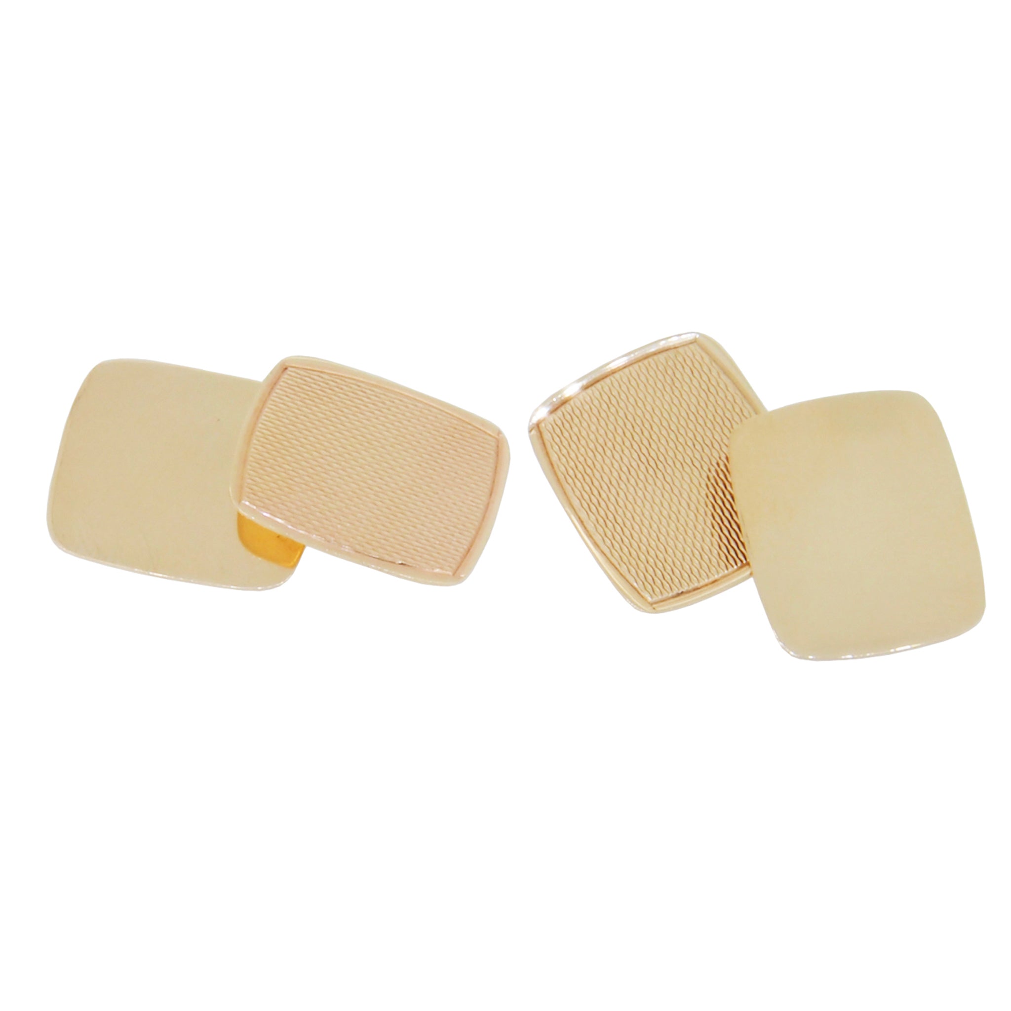 A pair of modern, 9ct yellow gold, cushion shape, chain link cufflinks with engine turned decoration.