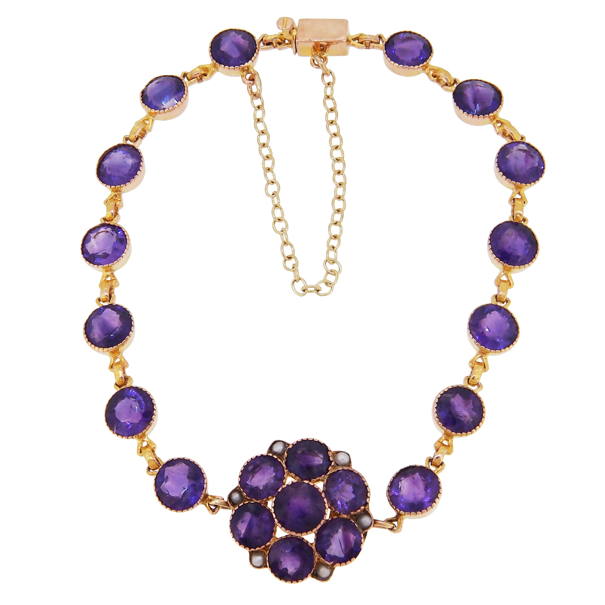 An Edwardian, 9ct yellow gold, amethyst & pearl set bracelet.
